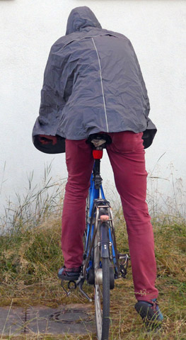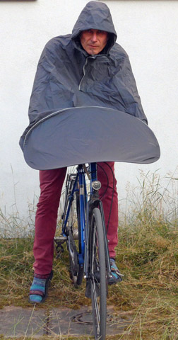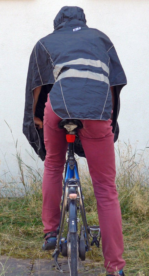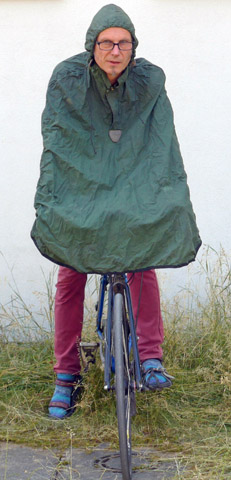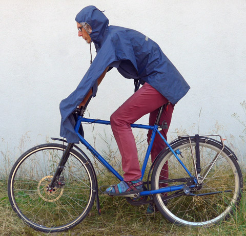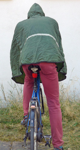 Das Carradice Poncho ist faszinierend anders als übliche Regenkleidung – in jeglicher Hinsicht. Der dicht gewebte Baumwollstoff ist sehr reißfest und sieht auch nach Jahren der täglichen Nutzung nicht schäbig, sondern nur etwas verblichen aus. Sollte man doch mal mit Gewalt einen Riss ins Gewebe schaffen, lässt sich dieser problemlos flicken. Sollte das aktuelle Modell zu weit ausfallen, ist es schnell mit ein paar Abnähern kleiner gemacht. Während der dichte Bauwollstoff durchaus kein Wasser hindurchsickern lässt, saugt von innen dagegen gedrückte Baumwollkleidung merklich Wasser auf. Es empfiehlt sich deshalb, eine Lage Kunstfaserkleidung wie z.B. einen Fleecepullover darunter zu tragen. Ein bis zweimal jährlich sollte ein viel benutztes Duxback Cape mit »reproofing wax« behandelt werden – eine längere Prozedur mit Wachs auf einem Lappen und einem Fön. Gefallen gefunden habe ich besonders am knappen Schnitt vorne und an den Seiten, die gerade beim Einhängen an Rennlenker-Bremsgriffen und gemäßigt sportlicher Sitzposition nicht flattern. Die langlebige, elegant zurückhaltende Gestaltung kommt mir entgegen. Nachteile sind das für mich zu kurze Rückenteil des alten Modell und das sehr langsame Trocknen – wenn man den Poncho auf Radtour eigentlich gerne wieder klein zusammengeknüllt wegpacken würde.