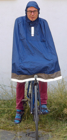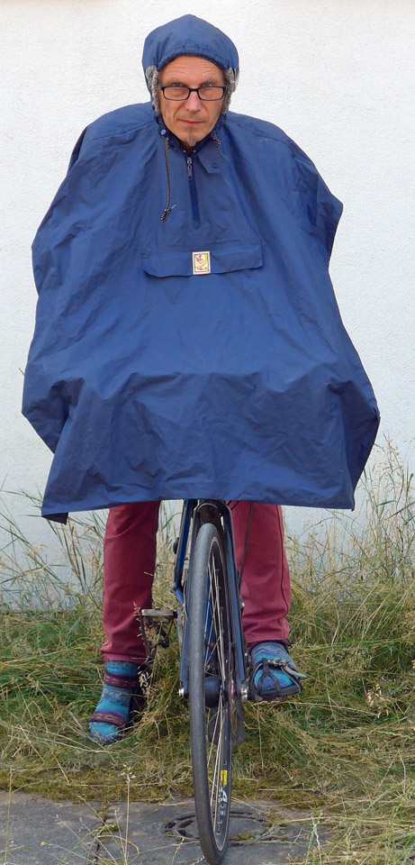 In Dänemark wird im Alltag viel Fahrrad gefahren, trotz häufigem Regen und Wind. Von daher wundert es nicht, dass dort ein Designbüro einen Fahrrad-Poncho in allen Aspekten neu durchdacht hat. Prinzipiell ist es eine offene Konstruktion wie der Hock Rain Care – seitlich aber etwas weiter herunter gezogen. Der Bereich, der vorne vor dem Lenker herunterhängt, lässt sich um ca. 15 cm hochraffen, damit bei sportlich tiefem Lenker der Scheinwerfer nicht verdeckt wird. Die Schlaufen für Hände bzw. Bremsgriffe sind mit robustem Klettband im Poncho befestigt und ebenfalls 15 cm in ihrer Höhe verstellbar. Die Frontpartie ist erheblich breiter geschnitten als der Rücken. Alles ist elegant gerundet. Die großzügige Kapuze ist in ihrer Weite mit einem Kordelzug verstellbar, was kräftig zusammengezogen auch einen guten Schulterblick ermöglicht. Die Kapuze ist innen angenehm mit Futterstoff ausgekleidet und kann im Kragen verstaut werden. Außergewöhnlich ist das Material: Es handelt sich zwar auch um PU-beschichtes Nylon, aber Stoff und Beschichtung sind deutlich schwerer ausgeführt als üblich. Zusätzlich sind großzügig reflektierende Elemente angebracht.