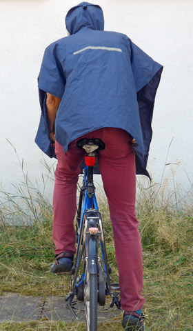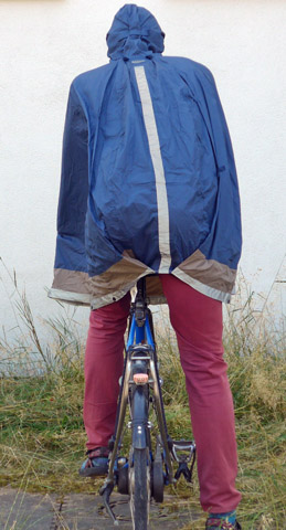 Der Federring des »Boncho« bietet nur bei recht aufrechter Sitzposition bessere Beschirmung der Beine als gängige Modelle. Ein normaler Poncho über Lenkertasche und Rennlenker gezogen sorgt für vergleichbar guten Regenschutz der Beine. Handgurte und Kapuze sind für meine Art der Nutzung unkomfortabel. Wer aufrecht auf einem Hollandrad ohne Lenkertasche langsam durch den Regen fährt und die Kapuze mit einem Helm fixiert, mag gut mit diesem Poncho zurecht kommen.