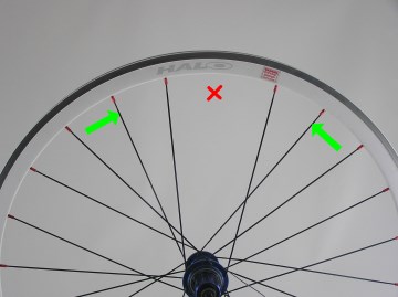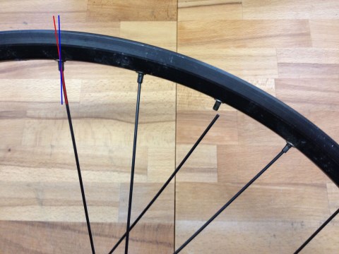 - Bruch am Nippel: Wenn der Nippel sich nicht im Winkel der Speiche ausrichten kann, ist ein Bruch unter dem Speichengewinde »garantiert«.