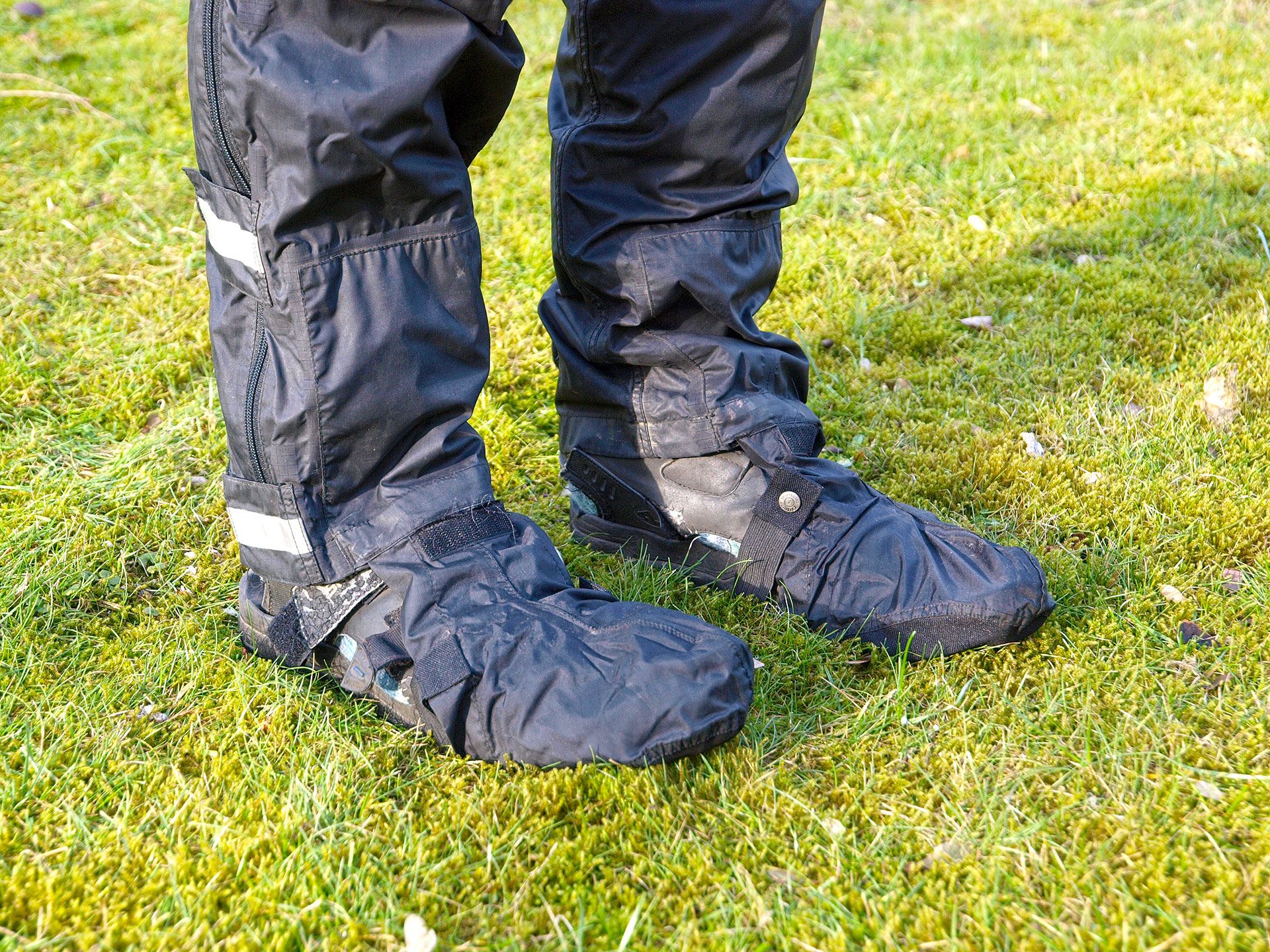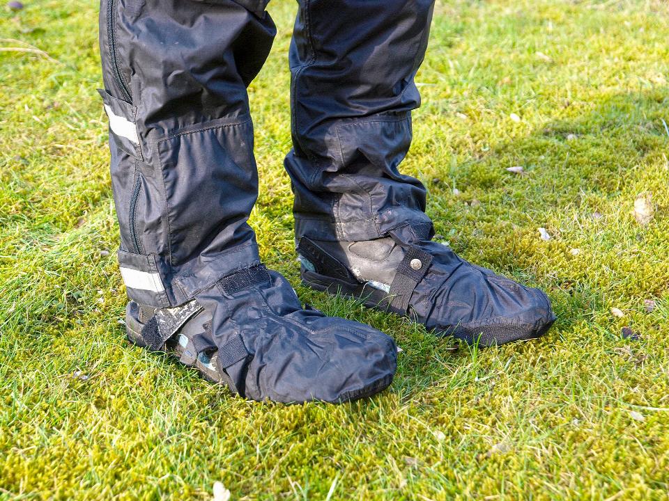 Bei längeren Fahrten in anhaltendem Regenwetter sind seit gut zehn Jahren Überzieher von Gore Bike Wear aus dem MTB-Bereich im Einsatz. Das Anziehen von Regenhose, Schuhen und Überschuhen ist zwar etwas fummelig und zeitaufwändig, der Schutz ist aber perfekt. Die Sohle ist mit Aramid verstärkt, hat Öffnungen für Klickpedale und die Ferse. Bislang zeigt sie nur Gebrauchsspuren und hat auch längeren Tragepassagen über Stock und Stein sehr gut standgehalten.