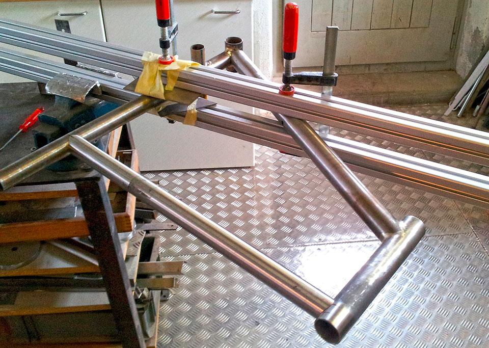 Gebaut habe ich den Rahmen in einer Kellerwerkstatt. Als Maschinen standen mir Schraubstöcke, eine robuste Standbohrmaschine sowie ein Bandschleifer und ein Schleifbock zur Verfügung. Statt einer Lehre habe ich Profile von Alvaris verwendet. Sie sind für meine Ansprüche ausreichend gerade und Klemmschrauben zur Befestigung von Rahmenteilen lassen sich sehr flexibel anbringen.