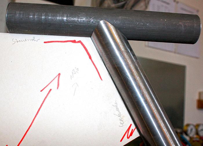 Den Entwurf hatte ich teilweise mit dem OpenSource-Programm RattleCAD, das erfreulicherweise auch auf Linux läuft, gemacht. Allerdings unterstützt die Software keine vollgefederten Konstruktionen, für den Entwurf des Hauptrahmens war sie jedoch eine große Hilfe. Auch kann man mit dem Programm gleich passende Rohrabwicklungen ausdrucken, die das Erstellen der Gehrungen erleichtern.