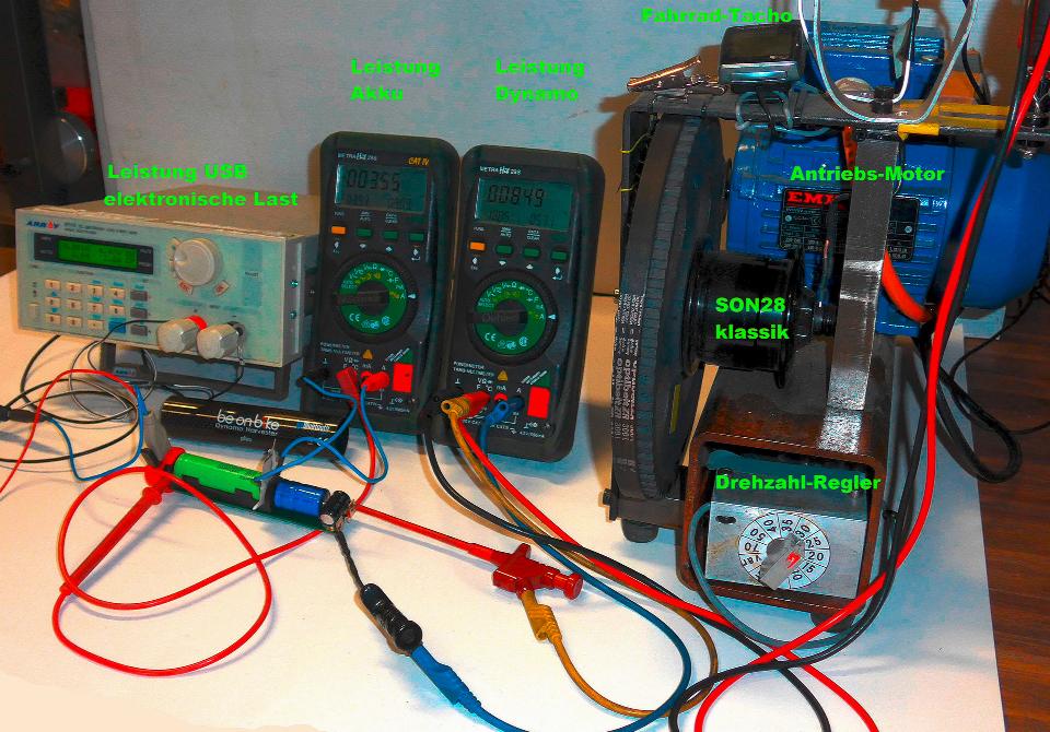 Vermessen wurde die Lade-Elektroniken an einem per Motor angetriebenen Nabendynamo SON28. Als Laufraddurchmesser wurde ein 28″-Rad mit 700 mm Durchmesser angenommen. Die elektrische Ausgangsleistung der Dynamos sowie die Lade-/Entladeleistung in den Puffer-Akku des Ladeadapter wird mit jeweils einem GMC Metrahit 29S gemessen. Als USB-Verbraucher dient die programmierbare elektronische Last Array 3711A. Sie ermöglicht es die USB-Verbrauchsleistung auf 0,1 W genau einzustellen sowie Spannung und Strom zu messen.