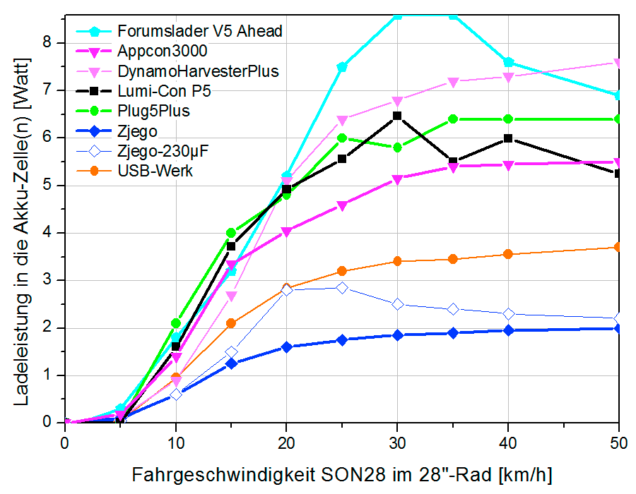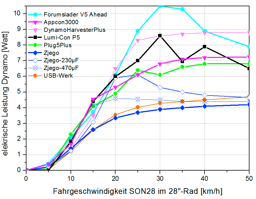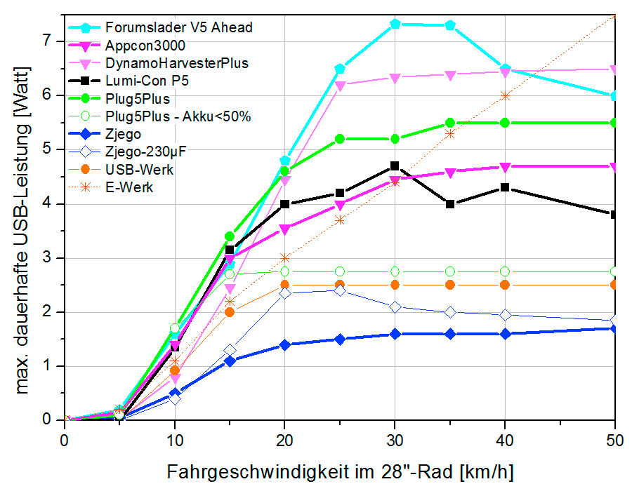 Mit reichlich 2 W will ein modernes Smartphone ständig nachgeladen werden, um tagsüber mit maximal heller Beleuchtung als Navi zu dienen. Das unveränderte ZJEGO schafft das auch bei schneller Fahrt nie – bzw. nur durch Leeren seines Pufferakkus. Mit einem Serienkondensator von 200–300 µF zwischen Nabendynamo und Gerät klappt das immerhin ab knapp 20 km/h. Kaum ein Reiseradler schafft das aber dauerhaft auch bei Gegenwind und bergauf. »The Plug V plus«, »Appcon3000«, »USB P5« und »Forumslader V5 Ahead« begeistern damit, schon bei 11–12 km/h genug Leistung zu liefern. Die Entwickler des Plug V begrenzen die Ausgangsleistung im Normalfall auf 2,8 W – was ausreicht für den Betrieb eines Smartphones. Nur wenn der Pufferakku nahezu voll geladen ist, stehen bis zu 5,5 W am USB-Anschluss zur Verfügung, um damit z.B. einen Smartphoneakku auch nachzuladen.