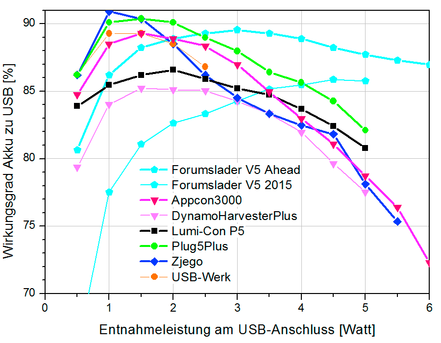 Alle hier betrachteten Ladeadapter sind relativ verlustarm, wenn es darum geht, aus dem Puffer-Akku wieder USB-Spannung für einen Verbraucher zu generieren. Der billige ZJEGO hat bei niedrigen Leistungen hier sogar die Nase vorne. Bei hohen Leistungen des USB-Verbrauchers ist der Forumslader der effizienteste. Der »Appcon3000« enttäuscht etwas mit unter 80 % Wirkungsgrad bei hohen Leistungen. Wer allerdings sein Smartphone oder GPS-Gerät dauerhaft am Ladeadapter betreibt und somit nur der akute Verbrauch und nicht der Akku des Verbrauchers nachgeladen werden muss, bewegt sich eher bei 1–2 W, wo alle getesteten Ladeadapter ordentliche Effizienz zeigen. Doch wer bei der Fahrt nur den Pufferakku des Laders lädt um bei Pausen dann mit 4–6 W den Smartphone-Akku nachzufüllen sollte genauer hinsehen.