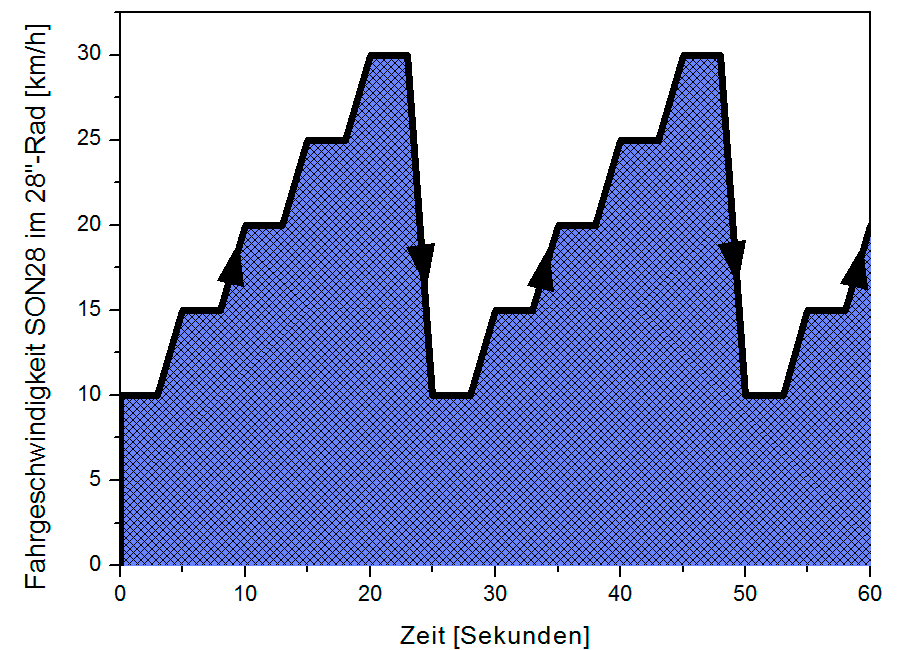 Die High-Tech Ladegeräte »The Plug V plus«, »Appcon3000« und »Forumslader V5 Ahead« verhalten sich nicht immer gleich bei konstanter Nabendynamo-Drehzahl. Gerade beim »The Plug V plus« kann man am Messgerät sehen, wie nach einer sprunghaften Drehzahländerung der Microcontroller das elektrische Verhalten über mehrere Sekunden einregelt. Beim Forumslader gibt es feste Schaltpunkte für verschiedene Serienkondensatoren, aber mit einer gewissen Hysterese und Verzögerung. Die Angaben in den zuvor gezeigten Diagrammen stellen das Verhalten bei langfristig konstanter Nabendynamo-Drehzahl dar. Real fährt man aber sowohl in der Stadt wie auch im hügeligen Gelände mit ständig wechselndem Tempo. Es ist nun nicht ganz offensichtlich, wie gut die Algorithmen der modernen Lader damit umgehen können. Deshalb haben wir in einem eigenen Test ein sehr dynamisches Geschwindigkeitsprofil nachgefahren. Zunächst wird der Pufferakku des Ladeadapters mit 2,5 W am USB-Ausgang bis zum »Akku leer«-Abschalten entladen. Dann startet der Versuch. Die Fahrgeschwindigkeit des Nabendynamo wechselt dabei von 10 auf 15 auf 20 auf 25 auf 30 km/h. 3 Sekunden dauert jeweils die lineare Beschleunigungsphase, gefolgt von 2 Sekunden konstantem Tempo. Von 30 auf 10 km/h wird ebenfalls in 3 Sekunden linear verzögert und 2 Sekunden konstant gefahren. Dieser Zyklus läuft insgesamt 20 Minuten. Nach einer Abkühlpause wird der Pufferakku wieder mit 2,5 W am USB-Ausgang entladen und die entnehmbare Energie in Wh gemessen, bis sich der USB-Ausgang abschaltet.