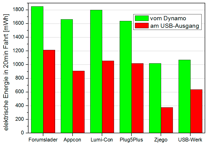 Die Ergebnisse dieses dynamischen Fahrzyklus weichen weniger von den zuvor ermittelten Werten ab als befürchtet. Der »Forumslader V5 Ahead« kann bei schneller Fahrt viel Energie ernten. Der »P5« schafft es zwar, ähnlich viel Energie vom Dynamo einzusammeln, hat dann intern aber größere Verluste. Aber er bleibt doch auf Platz 2, was die Menge der entnehmbaren Energie angeht. »The Plug V plus« folgt knapp dahinter. Wenn man davon ausgeht, dass ein modernes Smartphone 5–12 Wh zum kompletten Laden benötigt, so dauert das mit diesem eher sportlich schnellen Fahrprofil auch mit den besseren Ladelösungen durchaus 2–4 Stunden Fahrtzeit. Bis auf »USB Generator Kit« schaffen es aber alle mehr Energie zu ernten, als ein Smartphone im Navigationsbetrieb in der gleichen Zeit verbraucht. Beim »USB-Werk« reicht es aber nur knapp. Wer wesentlich langsamer als dieses Geschwindigkeitsprofil unterwegs ist, wird mit »USB-Werk« oder »USB Generator Kit« am Smartphone nicht glücklich.