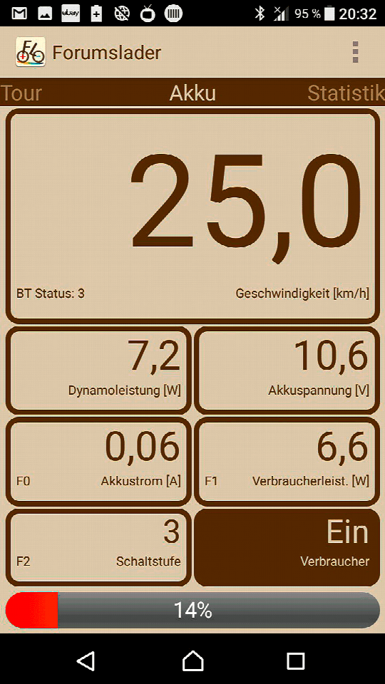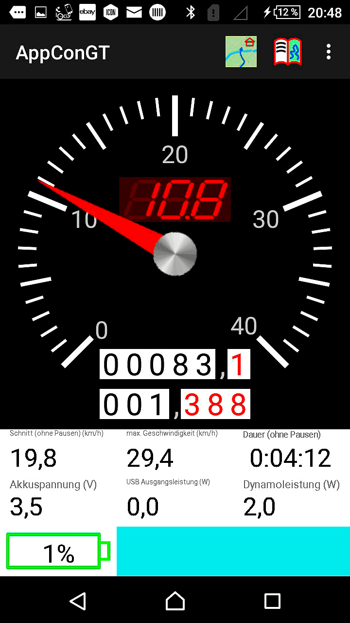 Viele Reiseradler haben das Smartphone heute stets am Lenker oder zumindest in der Lenkertasche, um sich navigieren zu lassen, die Strecke aufzuzeichnen oder Musik zu hören. Da ist es naheliegend das Telefon auch zu nutzen, um Informationen aus dem Ladeadapter detaillierter als mit den kleinen Status-LEDs anzuzeigen. Der Forumslader bietet schon seit vielen Jahren eine graphisch schlichte App für Android und iOS, die als Fahrradtacho Geschwindigkeit und Strecke aus den Nabendynamoimpulsen errechnet und anzeigt, aber auch Dynamoleistung, Akkustand und Verbraucherleistung anzeigen kann. Über eine Schaltfläche lässt sich der USB-Ausgang auch komplett abschalten um etwas Energie zu sparen, wenn nur der Pufferakku geladen werden soll. Die App von AppCon bietet ähnliche Informationen. Hier besteht zudem die Möglichkeit, eigene GPS-Tracks anzeigen zu lassen. Nachteil von »AppCon GT« ist derzeit aber, dass die App keine Daten vom »Appcon3000« empfängt und anzeigt, wenn der Nabendynamo sich nicht dreht. Man kann also nicht erst bei einer Pause das Smartphone anschalten und einfach den Ladestand des Pufferakku prüfen. Bei der Forumslader-App ist dies möglich. Gegebenenfalls bedarf es dann eines leichten Bewegens des Vorderrads, wenn das Gerät zuvor in den Schlafmodus wechselte. Wirklich notwendig sind die Apps aber nur zur Fehlerdiagnose. Alle Ladeadapter arbeiten einwandfrei ohne ständige Kontrolle. NC-17 versichert zudem, dass an einem Update der App gearbeitet wird, die eine Anzeige des Akkustand auch im Stand ermöglicht.