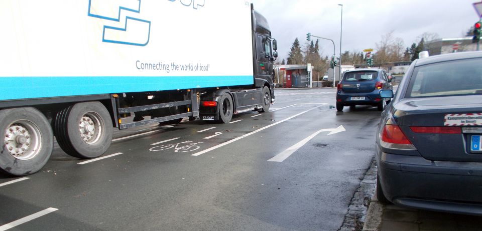 Obgleich der Radweg hier, abgesehen vom angeordneten Zweirichtungsverkehr und dem viel zu schmalen Gehwegrest (über weite Strecken unter 1 m breit), »idealtypisch« verläuft (parallel zur Fahrbahn ohne Sichthindernisse), bildet er schon seit vielen Jahren einen Unfallschwerpunkt. Genau das ist der Kern der Kritik an separater Führung neben der Fahrbahn: Die Radler bewegen sich außerhalb des bewussten Wahrnehmungsbereichs der Kraftfahrer.