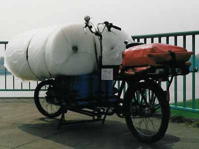 Die Ladefläche mit erhöhter Umrandung läßt sich sehr einfach beladen. Allerdings verursachen schlecht verzurrte Lasten bei plötzlichen Lenkbewegungen des Long Johns ein schwabbeliges Fahrverhalten, weil sie entsprechend der Fliehkräfte wandern. Es empfiehlt sich also die sorgfältige Fixierung mit Spanngurten. Die Ladefläche bietet dazu reichlich Ansatzmöglichkeiten. Stephan Thonett führte nicht nur Gurte, sondern zusätzlich noch eine große Plastikplane mit, um damit Lastgüter aller erdenklichen Formate fest umschließen zu können. Eine pfiffige Idee, mit der man auch mehrere kleine Ladestücke sicher und wettergeschützt verstauen kann. Empfindliche Lasten wurden als Stoßschutz auf eine kleine Matratze gestellt und erst dann umwickelt.