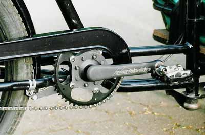 Im harten Alltagseinsatz benötigte Stephan eine erweiterte technische Ausstattung: Vorne Hydro-Pull (siehe Kasten «Hydraulische Trommelbremsen»), hinten 5-Gang-Pentasport-Nabe mit Trommelbremse, sowie ein Schlumpf Mountain Drive zwischen den Tretkurbeln. Damit bewältigte er auch stärkere Steigungen, solange er dabei nicht zu langsam wurde. Es ist ein grundsätzliches Problem bei Long Johns, daß sie bei langsamer Fahrt schwierig zu beherrschen sind. Pendelbewegungen der indirekten Lenkung zur Unterstützung des weit hinten liegenden Schwerpunktes geraten schnell zum raumgreifenden Schlingern. Im Gegensatz zum herkömmlichen Fahrrad ist man deshalb stärker auf die Verlagerung des Körpergewichtes angewiesen. Je schwerer die Beladung, desto eher stößt man dabei an die Grenzen.