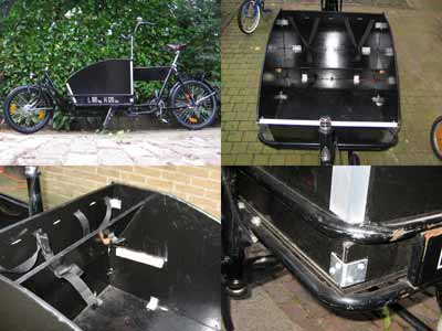 In privater Hand können Long Johns aber durchaus auch sinnvoll eingesetzt werden. Der Wochenendeinkauf inklusive Getränkekisten wird problemlos verstaut. Ebenso kann man den Nachwuchs zum Kindergarten kutschieren. In den Niederlanden, wo die Kinderbeförderung per Zweirad wesentlich intensiver genutzt wird als bei uns, schaute sich Willem Kusters eine Transportkonstruktion vom Bakfiets Cargobike (siehe unten) ab. Er baute eine Kiste für zwei Kinder mit klappbarem Sitz und Sicherheitsgurten. Als Material diente 10-Millimeter-Multiplexplatte, versiegelt mit schwarzem Klavierlack, an den Kanten mit Aluminiumwinkelschienen verstärkt. Kusters' Kiste wiegt 11–12 kg und paßt genau auf die Ladefläche. Aussparungen in den hinteren Kanten greifen zur Fixierung um den oberen Stahlrohrbügel der Plattform. Der Vorbau des Fahrrades mußte allerdings erhöht werden, damit der Lenker nicht an die Köpfe der kleinen Passagiere stößt. In der Abbildung lassen sich die Details der Konstruktion erkennen.