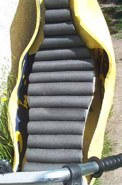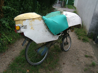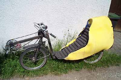 Als Unterkonstruktion verwende ich einen normalen Gepäckträger, auf den dann die Heckhutze wie Packtaschen aufgesetzt wird. Dadurch wird der Gepäckraum belastbar und bietet durchaus einem 10-Kilo-Reissack Platz. Mit einer Lage Schaum innen wird der Gepäckraum gegen den Radkasten abgedichtet. Auf ein Schutzblech über dem Hinterrad kann man daher verzichten. Nach vorne wird dann die Kontur an den Sitz angelegt.