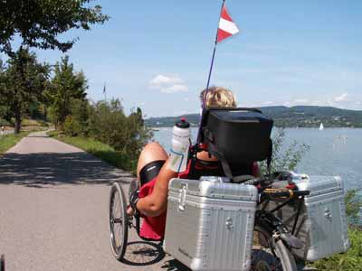 Dann begann meine Frau auch Liegerad zu fahren. Plötzlich fanden wir uns zusammen auf Radurlaub. Und auch zur Spezi fuhr sie mit ganz anderen Augen mit. Und sie erkannte sofort, dass das »was Gscheites« ist! Ich brauchte die Ausgaben nicht zu argumentieren, und so haben wir seit eineinhalb Jahren zwei Velocase.