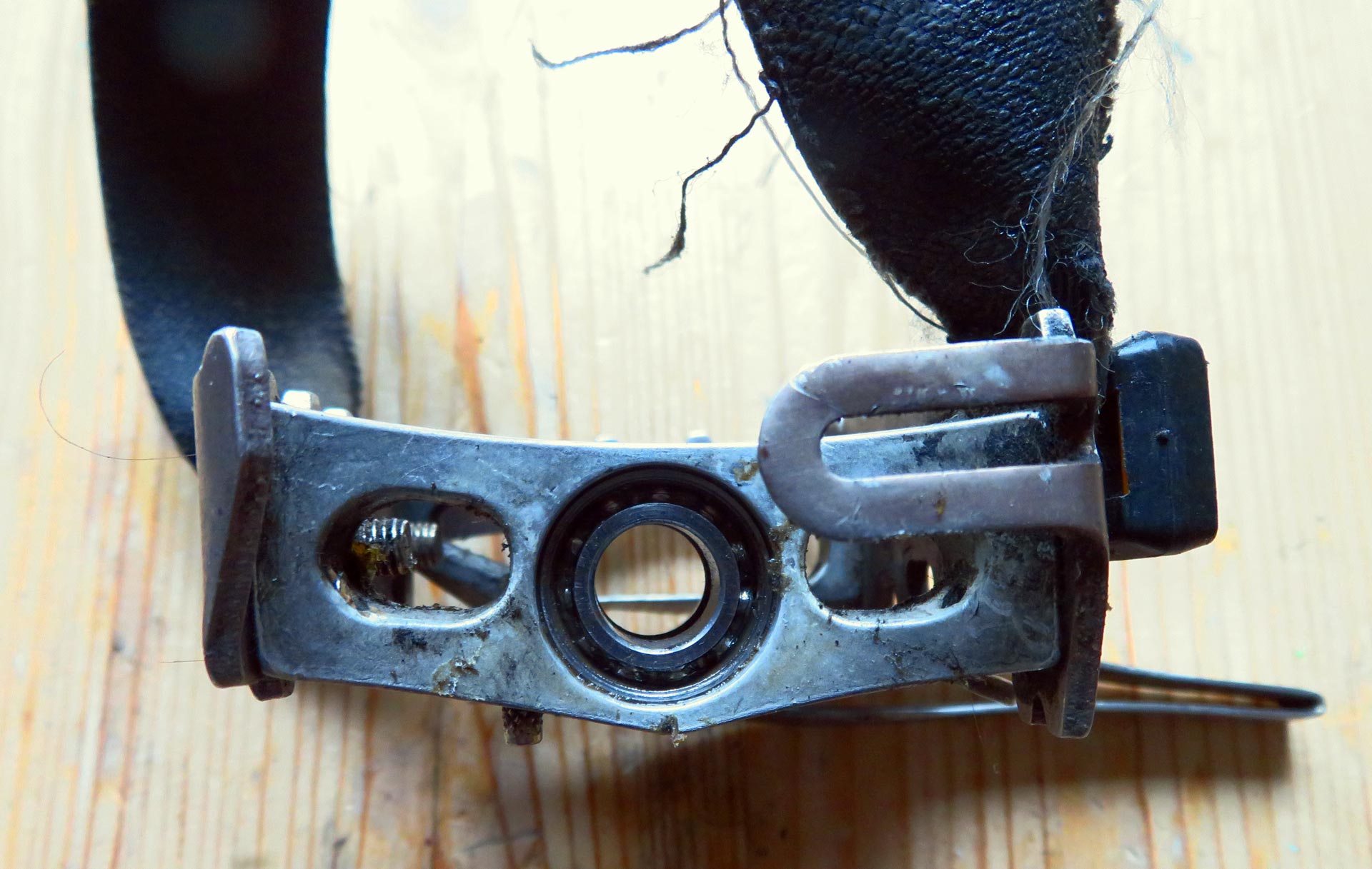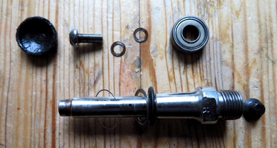 Unter der Kappe zeigt sich eine Inbussschraube der Größe 4, die sich leicht entfernen lässt. Hier gilt es jedoch erneut aufzupassen, da unter dem Kopf zwei kleine Passscheiben sitzen, mit denen sich das Spiel einstellen lässt. Hat man diese entfernt, kann man durch vorsichtiges Klopfen auf das Achsende die Achse zur Kurbelseite hin entfernen. Doch auch hier ist Vorsicht geboten. Auch in Bezug auf die Lagerung gibt es mindestens zwei Ausführungen: Bei der ersten ist nur auf der Außenseite ein Normlager, innen jedoch ein Konuslager mit losen Kugeln verbaut. Bei der anderen Version ist das Pedal innen auf ein spezielles zweireihiges Schrägkugellager abgestützt.