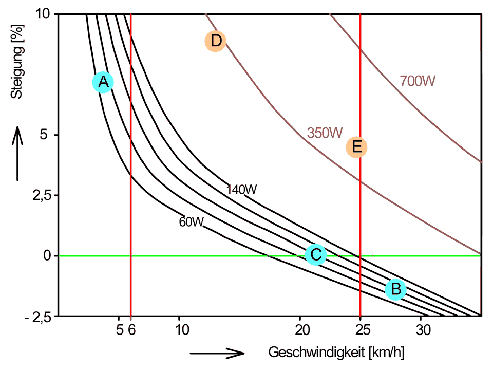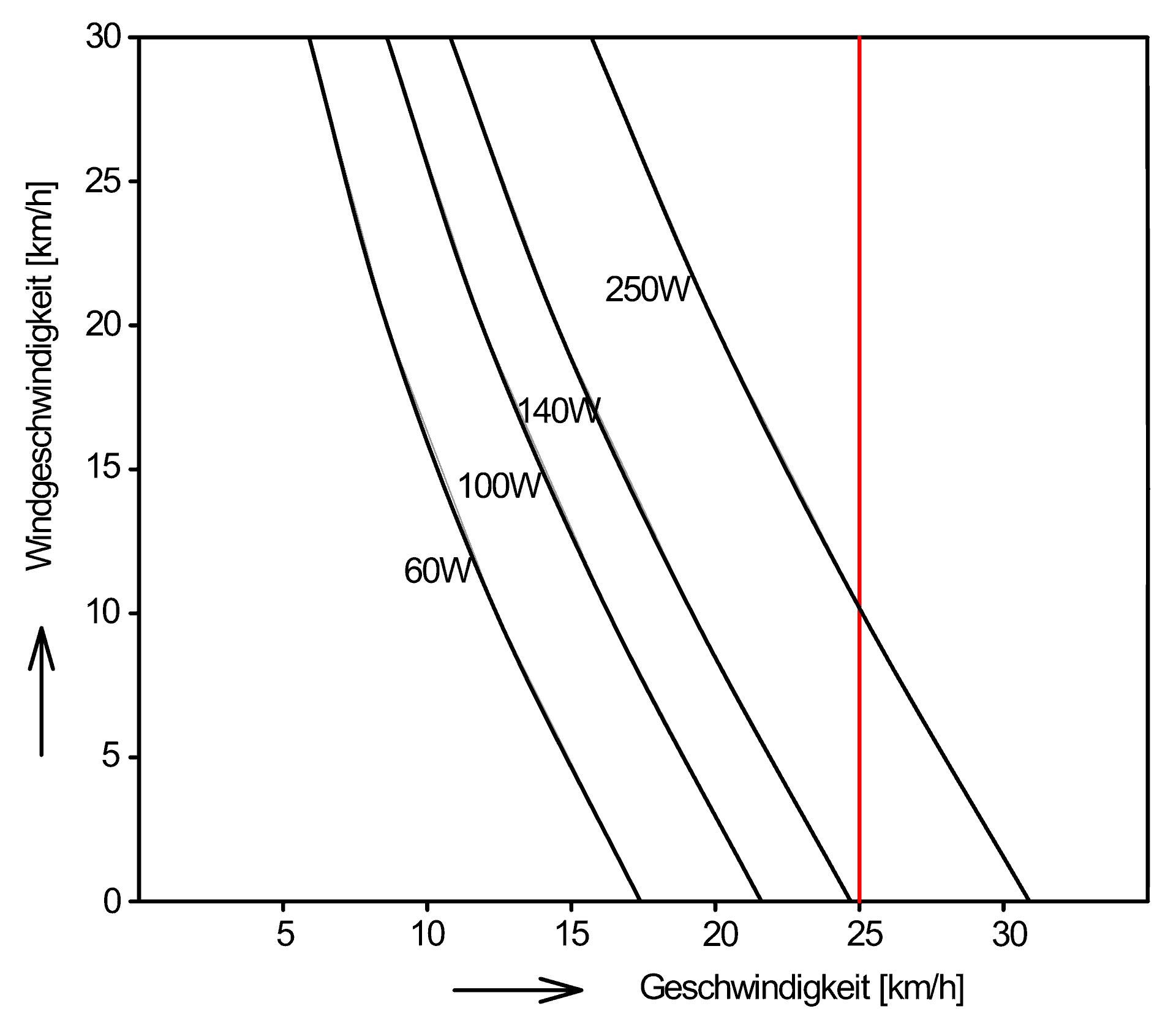 E Grenze der Motorunterstützung bei 25 km/h (rote Linie) – die Motorleistung ist gegenüber der Grenzgeschwindigkeit weit überhöht. Folge: Tendenz zum Ersatz.
