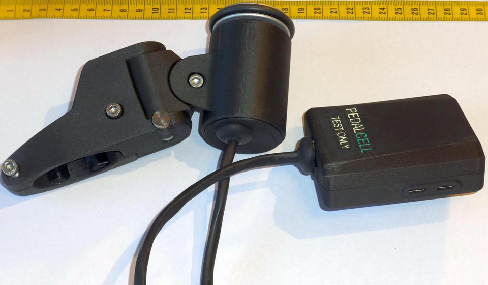 Zwei Hochschulabsolventen gründeten 2015 in Chicago die Firma PedalCell und arbeiten seither an der Entwicklung eines eigenständigen, leistungsstarken, schnell nachrüstbaren Dynamosystems mit USB-Ausgang, das über 15 Watt Leistung liefern soll. Das Testmuster, das wir Ende 2019 erhielten, zeigt noch die Herkunft der Kunststoffteile aus dem 3-D-Drucker. Kern ist ein Drehstromgenerator, dessen drei Ausgänge via 80-cm-Kabel zur zigarettenschachtelgroßen Elektronikbox mit zwei USB-C-Anschlüssen führen. Ein Pufferakku ist hier nicht enthalten. Geplant war der Verkaufsstart für Anfang 2020. Momentan werden für 250 USD Vorbestellungen für Ende des Jahres angenommen.