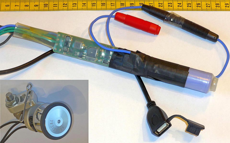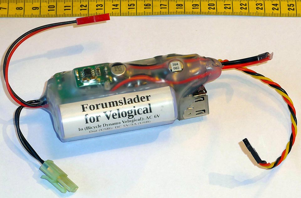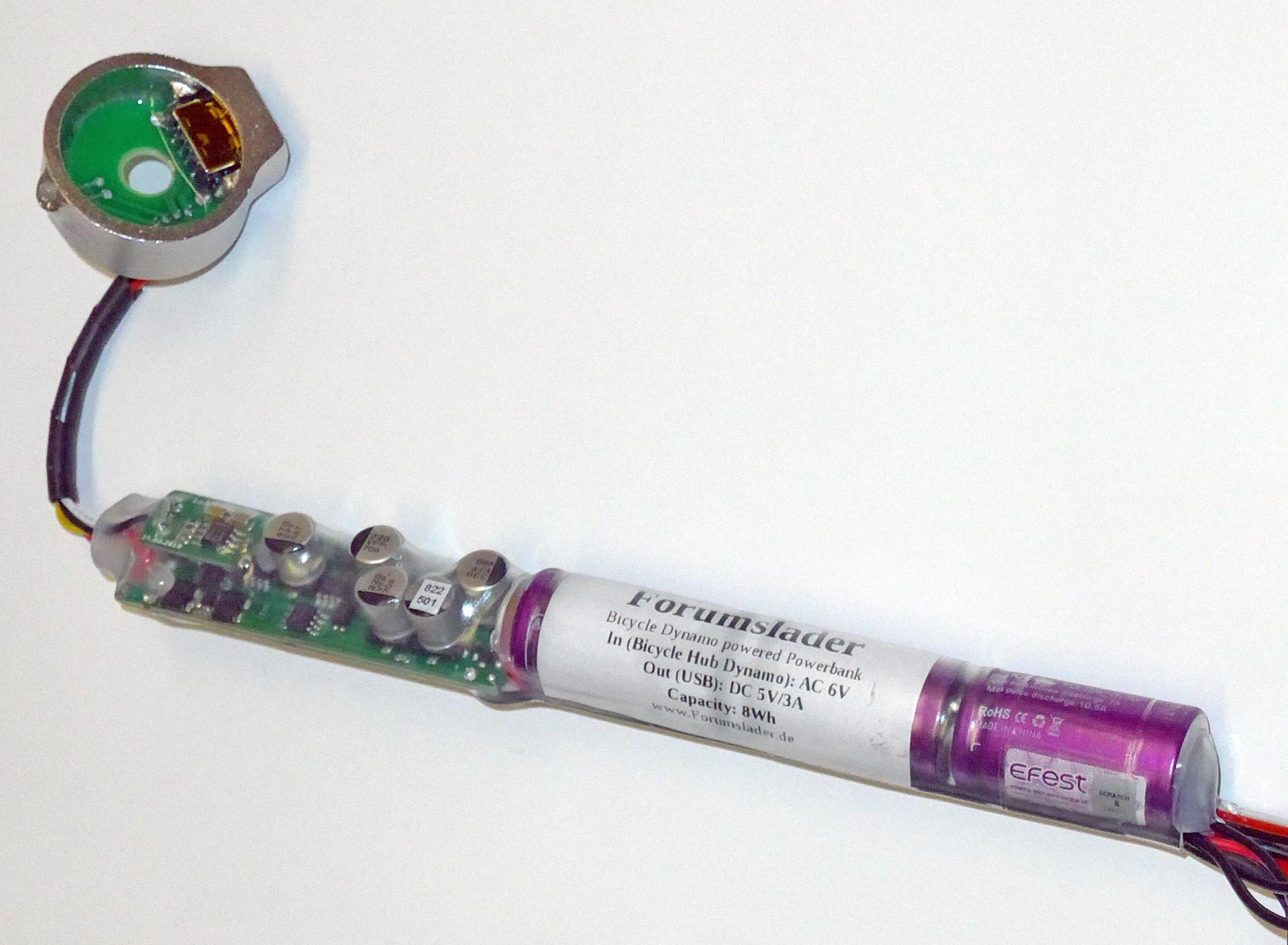 Mit nur 35 mm Reibrad-Durchmesser, halber Bauhöhe, kompakten Montageadaptern und komplett aus Metall gefertigten Bauteilen erscheint der Dynamo aus Köln das exakte Gegenteil des Modells aus Chicago zu sein. Allerdings sind die elektrischen Daten sehr ähnlich: Auch hier soll ein Drehstromgenerator über 15 Watt an USB bei 30 km/h liefern können, ebenso angetrieben mit einem auf der Felge laufenden O-Ring. Die dazu angebotene »Universal-Stromquelle« versorgt sowohl einen Anschluss für eine herkömmliche Dynamo-Lichtanlage bis zu 2 Ampere an einer USB-A-Buchse wie auch 12V-DC-Pedelec-Leuchten. Als Puffer wird eine 18650-Li-Ion-Zelle mit 2.850 mAh verwendet. Ähnlich wie der klassische Forumslader wird die Elektronik schlicht, aber funktionell in einen durchsichtigen Schrumpfschlauch verpackt. Mit 200 € für den Drehstromgenerator und 180 € für die »Universal-Stromquelle« wird klar, dass man hier nicht in Dimensionen von Reibraddynamos aus den 1970er Jahren denkt.