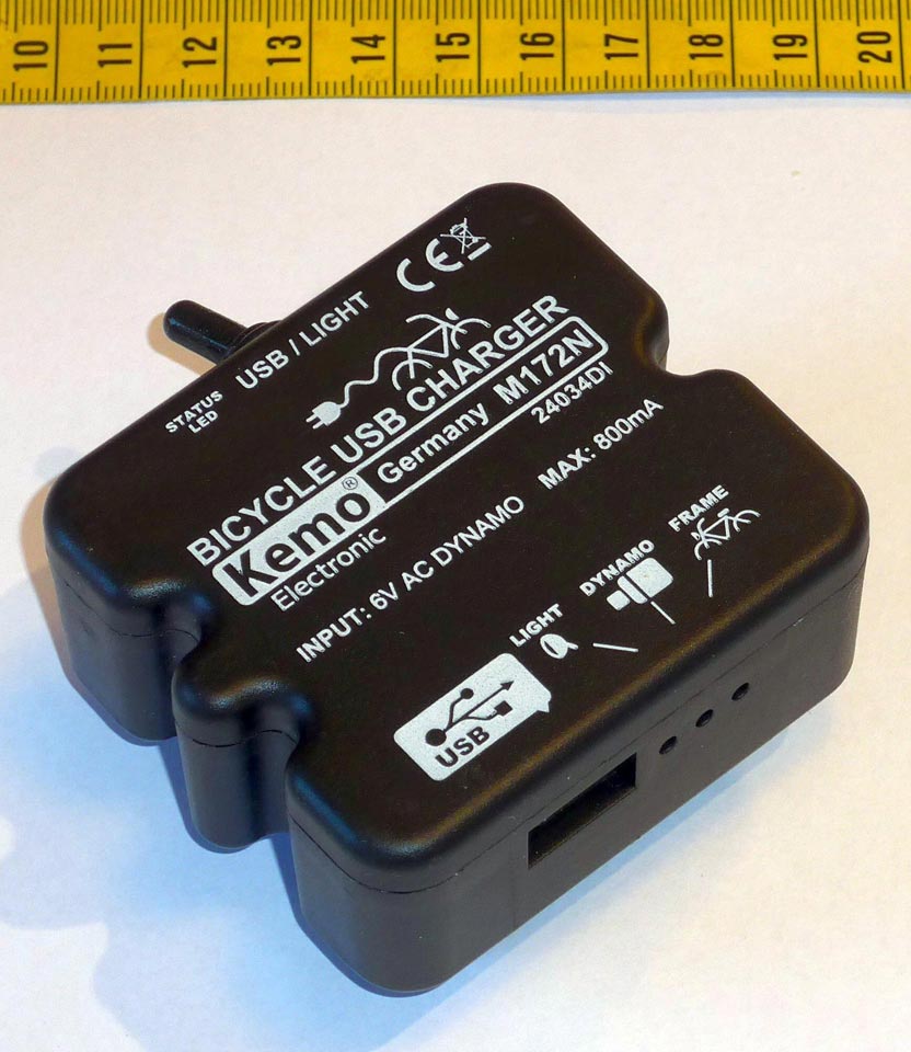Die Firma Kemo kommt nicht aus dem Fahrradbereich, sondern bietet eine große Zahl Elektronikbausätze für Bastler an. Der Anschluss an beliebige Dynamos und Leuchten erfolgt per Schraubklemmen. Eine LED signalisiert USB-Spannung. Der USB-A-Anschluss soll 500–800 mA liefern. Man findet das Gerät im Handel ab 30 € – nicht zu verwechseln mit dem leistungsschwächeren, aber kleineren Vorgängermodell ohne das »N« im Namen.