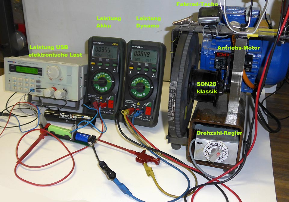 Vermessen wurden Igaro D2, Cycle2Charge V3 und Kemo M172N an einem per Motor angetriebenen Nabendynamo SON28. Der gleiche Testaufbau wurde auch in den letzten Artikeln dieser Reihe genutzt und beschrieben. Als Laufraddurchmesser wurde ein 28″-Rad mit 700 mm Durchmesser angenommen. Die elektrische Ausgangsleistung der Dynamos sowie die Lade-/Entladeleistung in dem Pufferakku des Ladeadapters wird mit jeweils einem GMC Metrahit 29S gemessen. Als USB-Verbraucher dient die programmierbare elektronische Last Array 3711A.