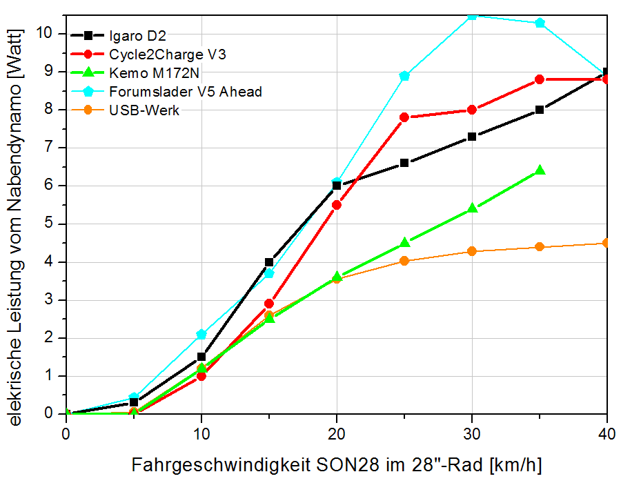 Der Igaro D2 kann bei mittlerem Tempo mit hoher Leistung begeistern. Bei 15 km/h liefert er sogar mehr Leistung an USB, als der Forumslader V5 dauerhaft bereitstellen kann.