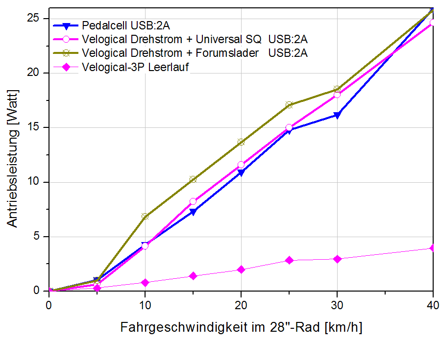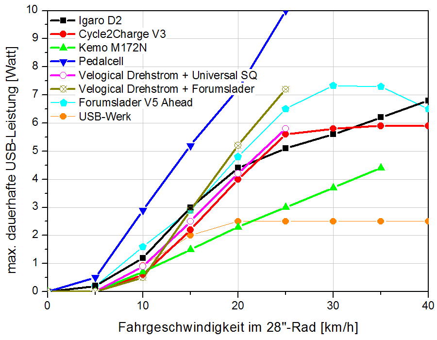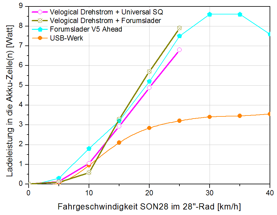 Am Velogical-Drehstromdynamo liefert der Forumslader stets etwas mehr Dauerleistung an USB als die Universal-Stromquelle.