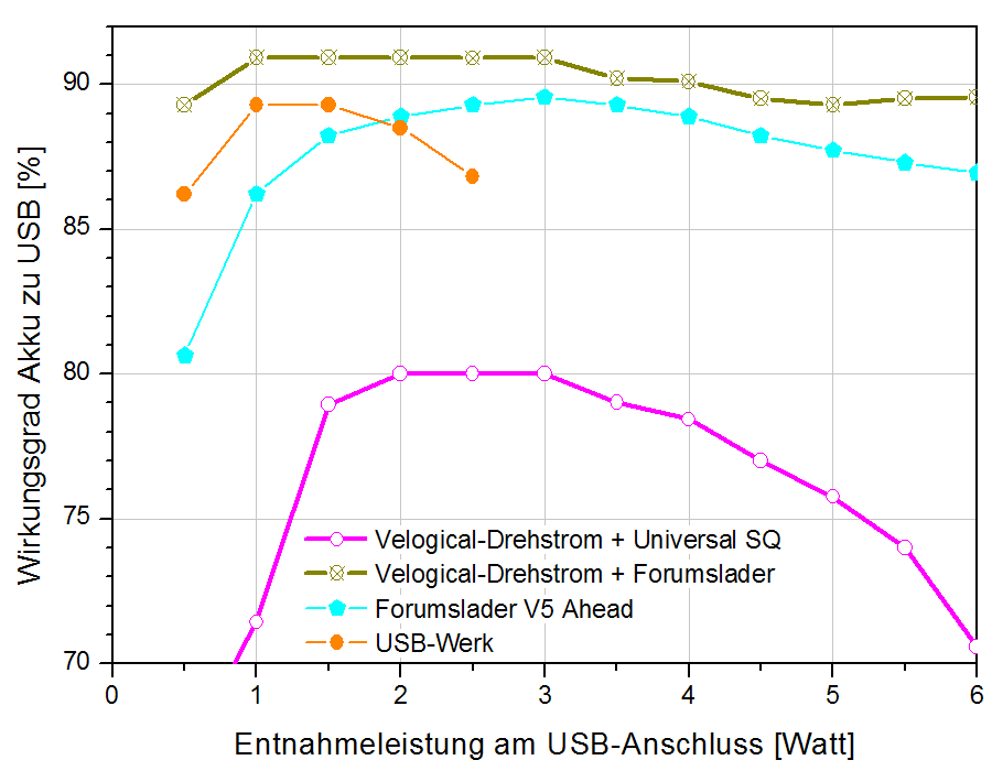 Alle hier betrachteten Ladeadapter sind relativ verlustarm, wenn es darum geht, aus dem Pufferakku wieder USB-Spannung für einen Verbraucher zu generieren. Der Drehstrom-Forumslader ist der effizienteste über den gesamten Leistungsbereich. Über 90 % Wirkungsgrad sind eindrucksvoll! Die Elektronik von Velogical enttäuscht mit unter 80 % Wirkungsgrad bei hohen Leistungen. Wer allerdings sein Smartphone oder GPS-Gerät dauerhaft am Ladeadapter betreibt, somit nur der akute Verbrauch und nicht der Akku des Verbrauchers nachgeladen werden muss, bewegt sich eher bei 2 Watt, wo alle getesteten Ladeadapter brauchbare Effizienz zeigen. Wer bei der Fahrt nur den Pufferakku des Laders lädt, um bei Pausen dann mit über 5 Watt den Smartphone-Akku nachzufüllen, sollte genauer hinsehen.