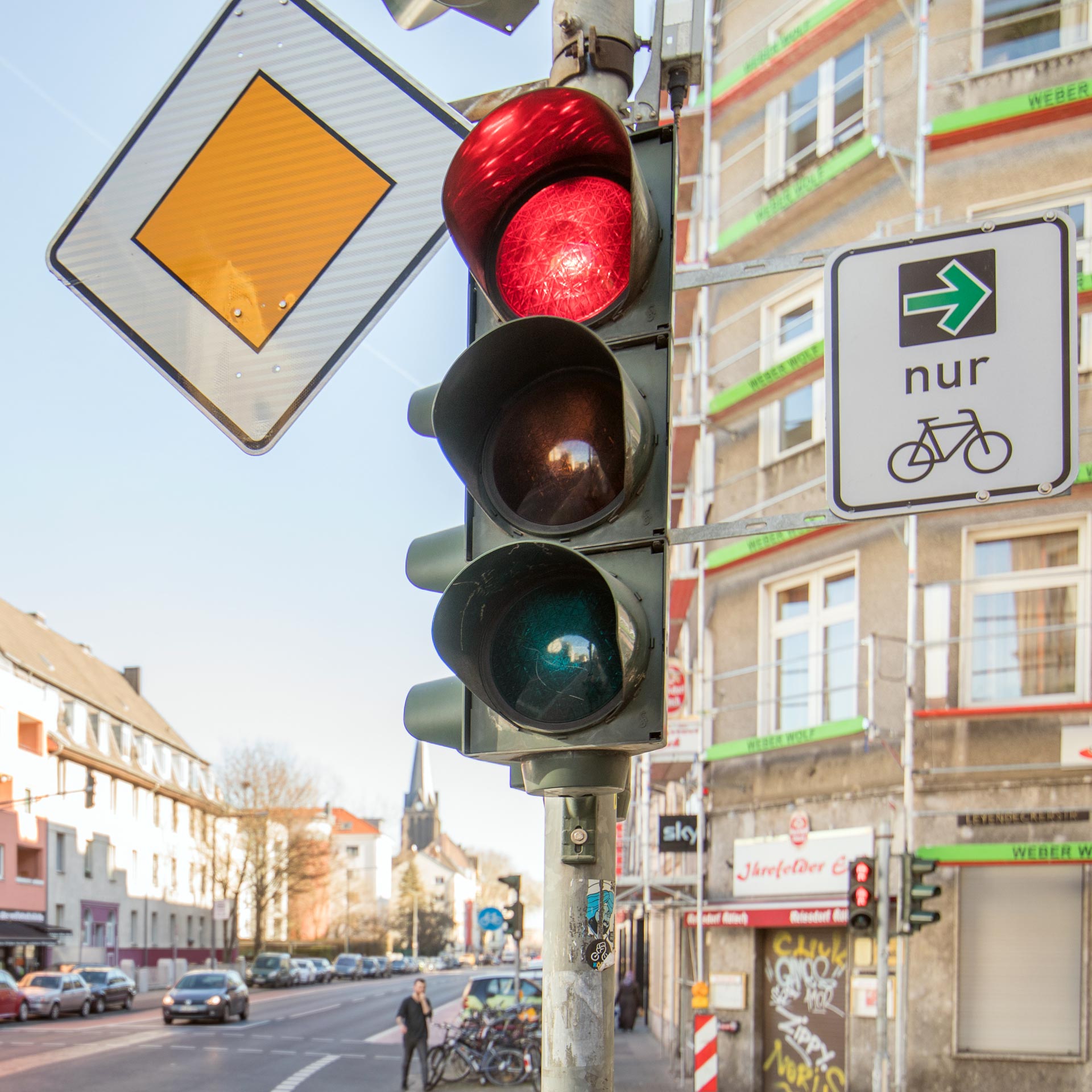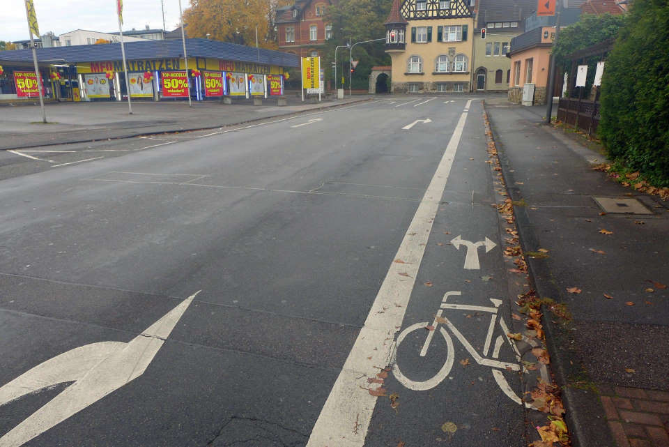 - Die geradeaus führende Radspur befindet sich rechts (und nicht links) der Kfz-Rechtsabbiegespur.