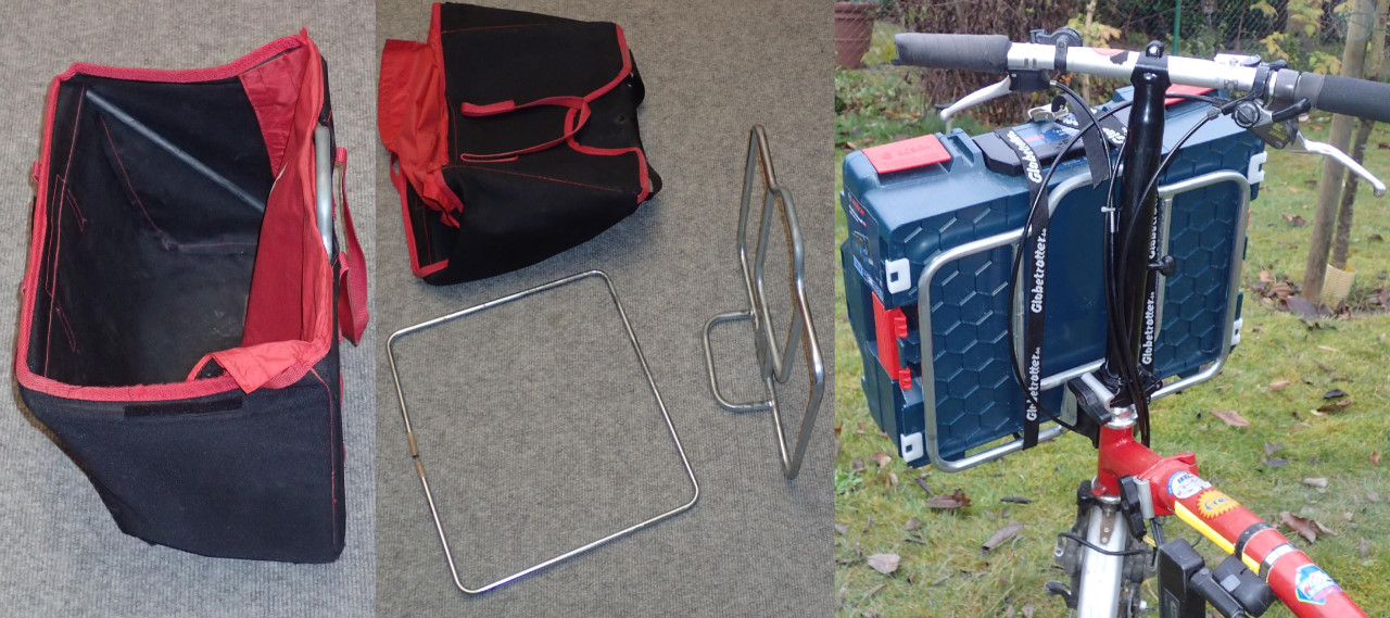In Sartène auf Korsika haben wir mal einen Engländer gesehen, der hatte von der Einkaufstasche nur das Gestell (hier 682 g) mit und einfach darauf quer zwei Packsäcke geschnallt. Das ist die einfache Variante. Zur Verdeutlichung möge Bild 1 dienen.