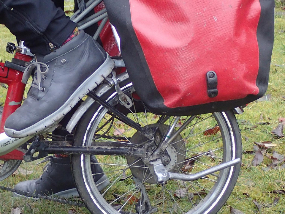 Die Hackenfreiheit ist gewährleistet. Die Taschen setzen nicht auf der Anhängerdeichsel auf. Die hier vorgestellte Lösung wiegt 482 g für den Gepäckträger selber und 82 g für die Taschenabweiser am Brompton-Träger (Bild 10).
