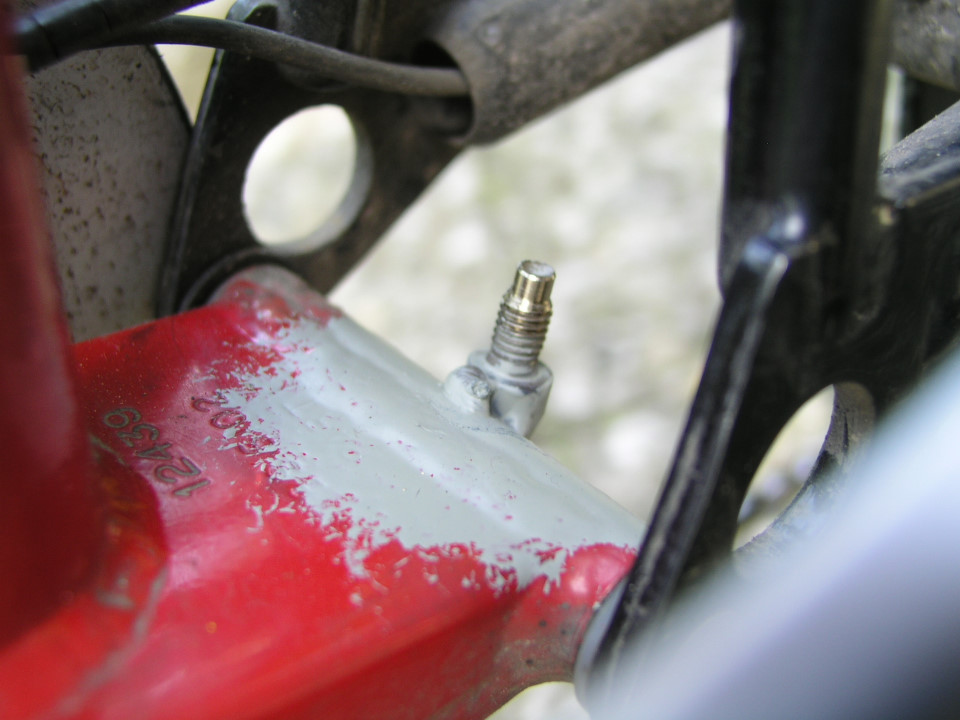 Die Widerlagerschraube am Schwingenlager (DIN 912-M6x20) lässt sich am besten schweißen. Dies ist die einzige Verbindung, wo der Autor Schweißen empfiehlt. Beim Löten dürfte in die Lager zu viel Wärme eingetragen werden. Eine »pfuschende« Alternative wäre wohl, einen Punkt etwas weiter vorne durch die beiden Blechteile zu suchen und dort eine längere Schraube durchzustecken und mit Muttern zu sichern.