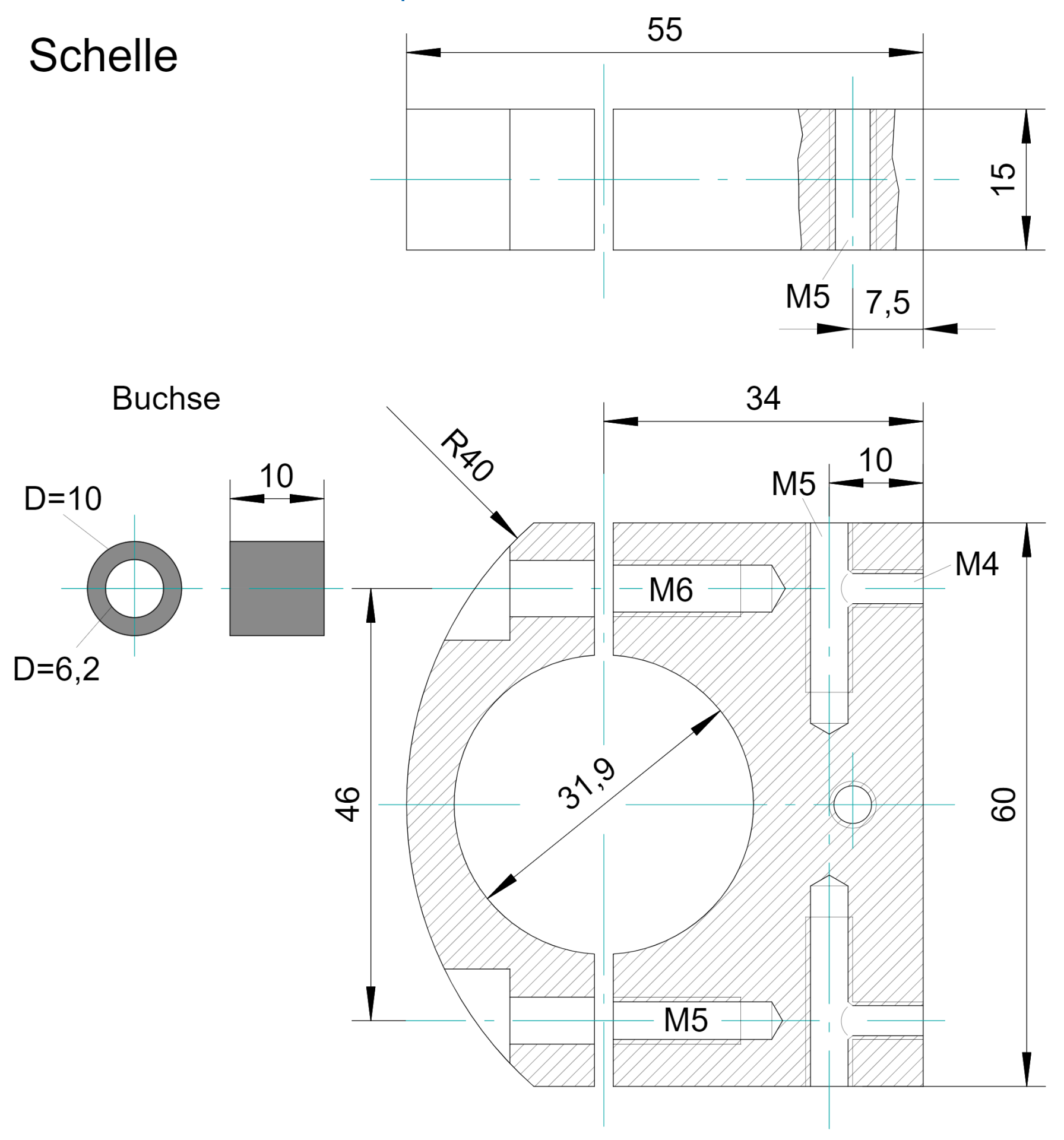 Für die Schelle (Bild 7) ist eine Drehbank oder Fräse oder jemand mit der Brompton-Reibahle für die Kunststoffbuchsen (Durchmesser 32 H7) hilfreich.