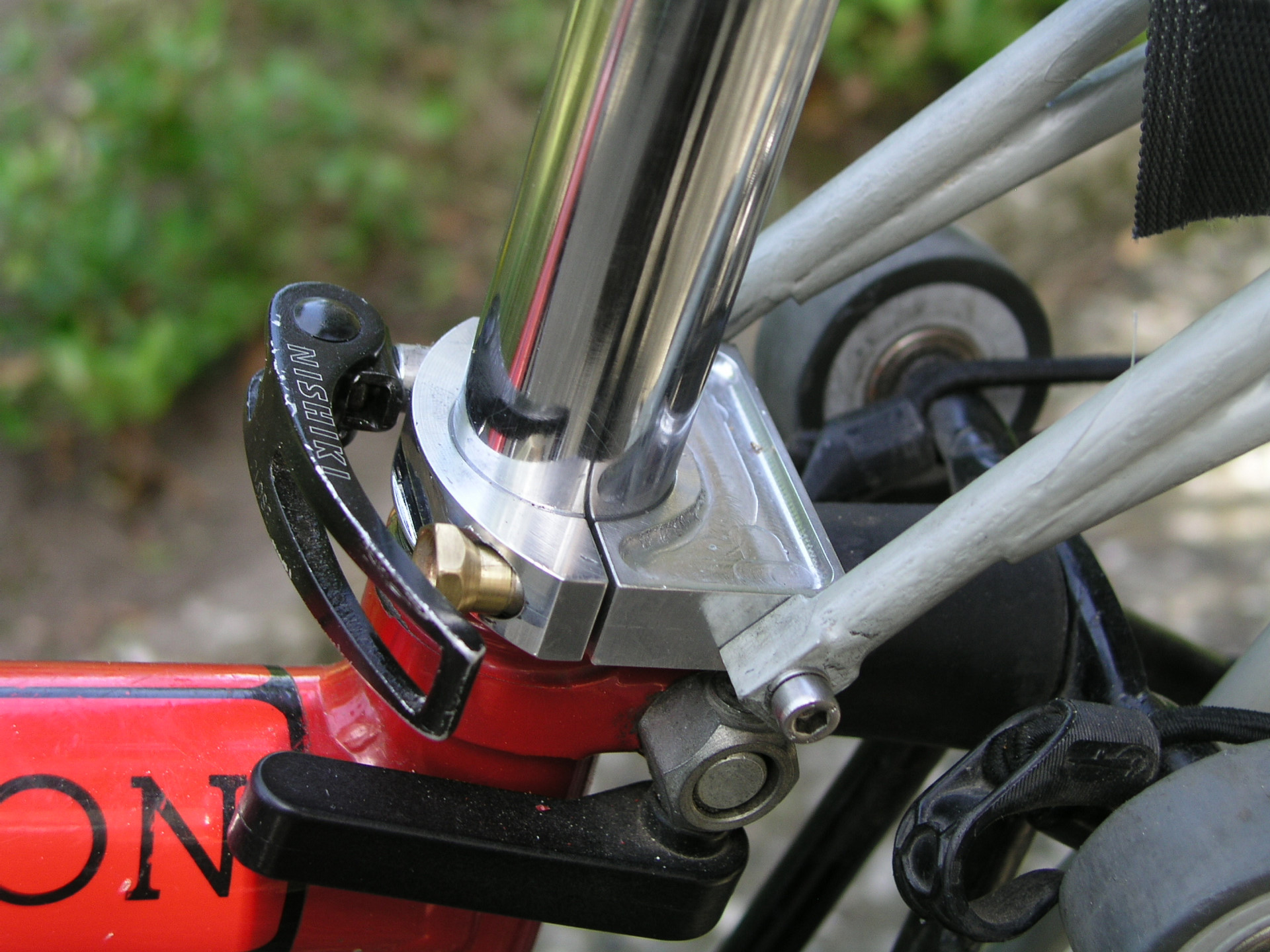 Die Schraube für die Ausschwenksicherung (Bild 9 rechts) muss u. U. einen kleineren oder größeren Kopf»durchmesser« erhalten. Je nach Verschleißzustand der Kunststoffbuchse der Sattelklemmung ist der Spalt der Sattelrohrschelle am Brompton unterschiedlich weit und maßgeblich für den Kopfdurchmesser dieser Schraube. Hier kann es sinnvoll sein, DIN 912-M5 oder -M6 zu nutzen.