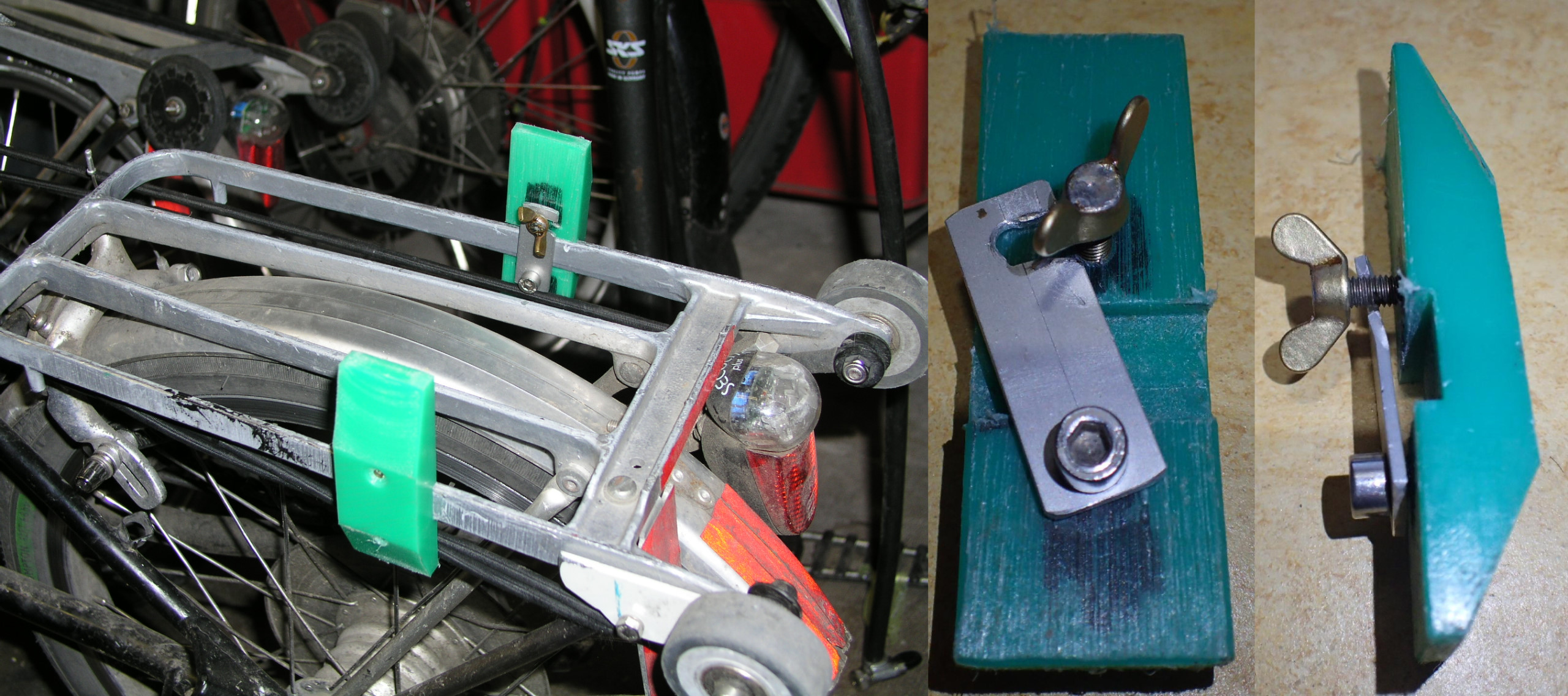 Die Taschenabweiser sind hier aus PE-Blöcken grob »zurechtgeschnitzt«. Sie werden mit den Flügelschrauben und einer Lasche auf dem Gepäckträger fixiert. Zumindest bei den hier verwendeten Ortlieb-Taschen sind sie sinnvoll, da die unteren Taschenanbauten sich sonst gerne mit dem eckigen Brompton-Träger verhaken.