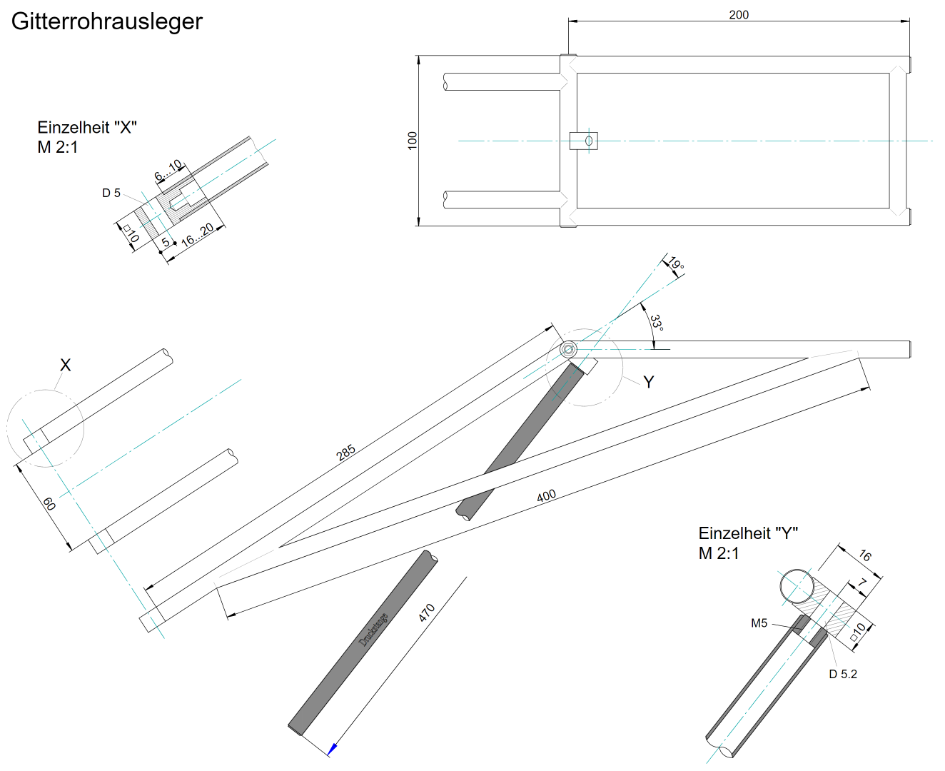 Über den Gitterrohrausleger (Bild 11) ist wenig zu schreiben. Die Terminals sind aus 10-mm-Quadratstahl hergestellt und ragen ca. 5 mm in das Rohr rein. Offene Rohrabschlüsse verfüllt der Autor am liebsten mit M5-(oder abgedrehten M6-)Muttern DIN 934 aus nicht rostendem Stahl (Bild 5).