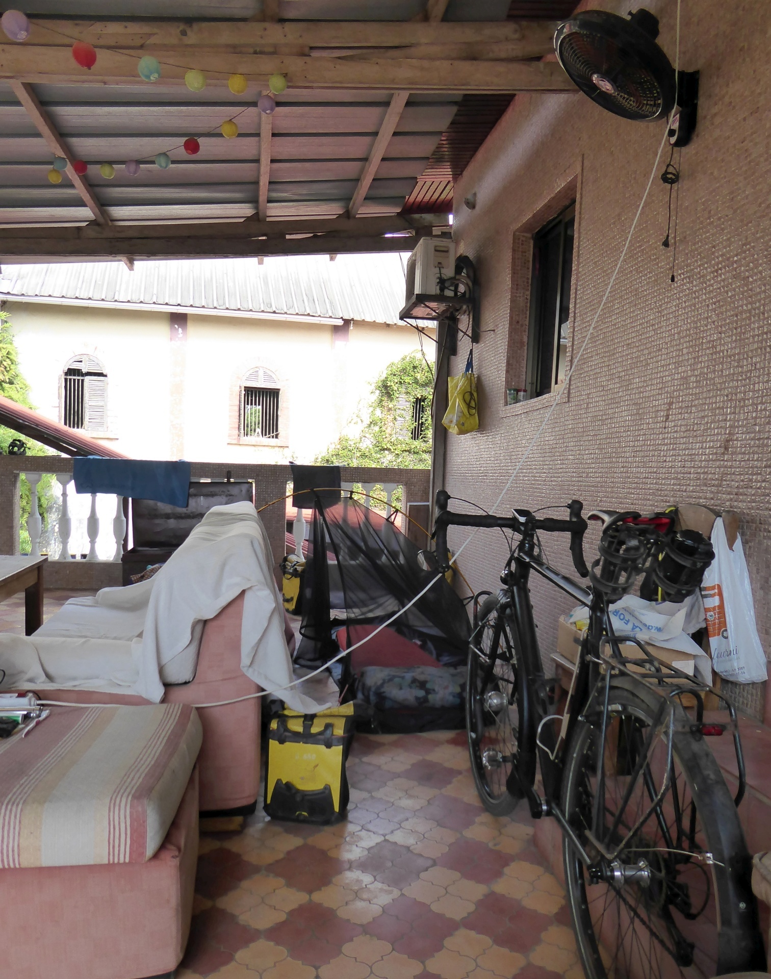 Ich lebe hier in Grand-Bassam in meinem Zelt auf dem Gelände eines komfortablen, bezahlbaren Gästehauses, genau genommen wohne ich auf dem Balkon, der mir Schutz vor der brennenden Sonne und dem zeitweise tropischen Regen bietet. Ich genieße eine großartige Aussicht auf ein altes Kolonialgebäude und auf eine atemberaubende Vogelwelt. Das kostet mich pro Nacht etwa 2 € und bietet mir den unglaublichen Luxus einer täglichen Dusche (mein Rekord ohne Dusche liegt bei 15 Tagen in der chinesischen Wüste).