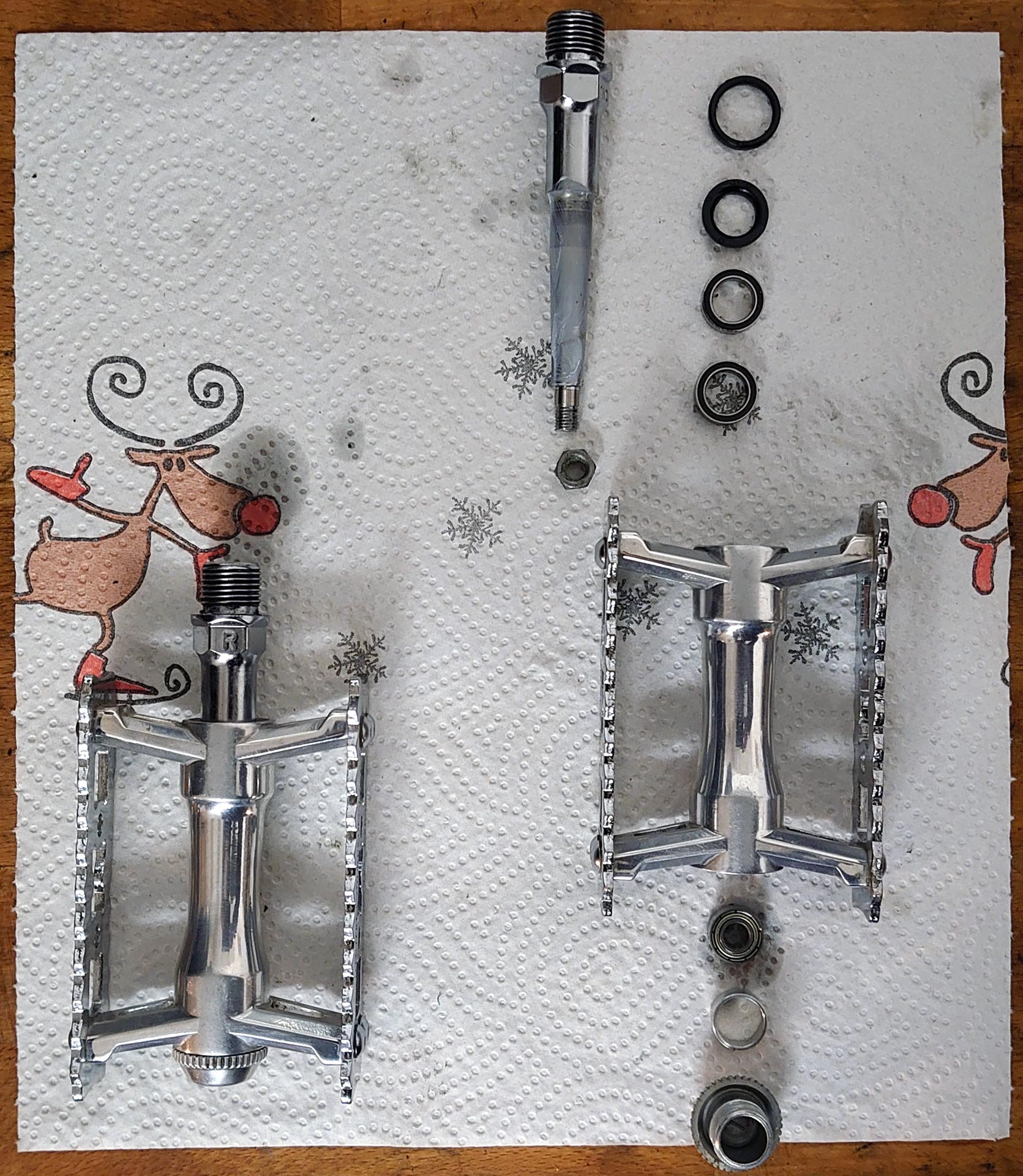 Seit Jahren nutze ich mit Zufriedenheit Pedale der Marke MKS und verbaue sie an all meinen Fahrrädern. Normalerweise sind es die Sylvian-Touring-Pedale mit einstellbarem und nachfettbarem Konuslager. An einem Fahrrad nutze ich jetzt seit einigen Jahren die teurere Variante Sylvian Touring Next, die butterweich und gefühlt noch reibungsärmer laufen. Nach einer Laufleistung von jetzt irgendwo zwischen 15000 bis 25000 Kilometern begann ein Pedal zu knacken. Also wurden die Pedale zerlegt (siehe Bild) und freudigerweise zeigte sich, dass Standardlager verbaut wurden. 6700-2RS und 686-ZZ. Das eine äußere 686-ZZ-Lager musste getauscht werden. Die Lager gibt es im Modellbauladen und zwei Stück 686-ZZ kosteten mich 3 Euro (im Internet natürlich billiger). Gefettet werden muss bei den Sylvian-Touring-Next-Pedalen nichts, da die Lager geschlossen sind. Und warum schreibe ich Ihnen das jetzt? Weil ich immer wieder positiv überrascht bin, dass es auch heute noch Komponenten gibt, die einfach und kostengünstig repariert werden können.