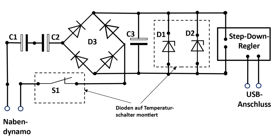 Da der verwendete Step-Down-Regler nur maximal 25 V verträgt, muss die maximale Spannung begrenzt werden. Dies erfolgt hier durch zwei parallel geschaltete 12-V-Zenerdioden, die die übrige Energie »verbraten«. Die Dioden sind auf einem Temperaturschalter montiert, bei 60°C wird der USB-Lader abgeschaltet. Höhere Spannungen wären hier wünschenswert, damit die mühsam erstrampelte Leistung nicht schon bei normaler Fahrt und vollem Handyakku in Wärme umgewandelt wird. Doch die zusätzliche Leistung lässt sich dann nur schwer wegkühlen (@ Andreas Oehler: Danke für den Tipp).
