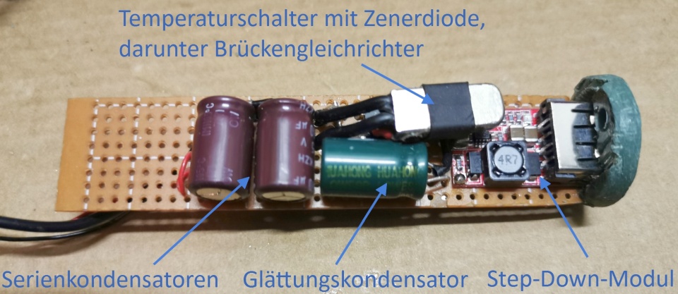Die Funktion des Serienkondensators (hier zwei polarisierte Elkos) ist in den Steckdose-unterwegs-Artikeln erläutert. Die einzelnen Schottky-Dioden des Minimal-Laders wurden durch einen Schottky-Brückengleichrichter ersetzt, was Platz spart und das Löten einfacher macht.