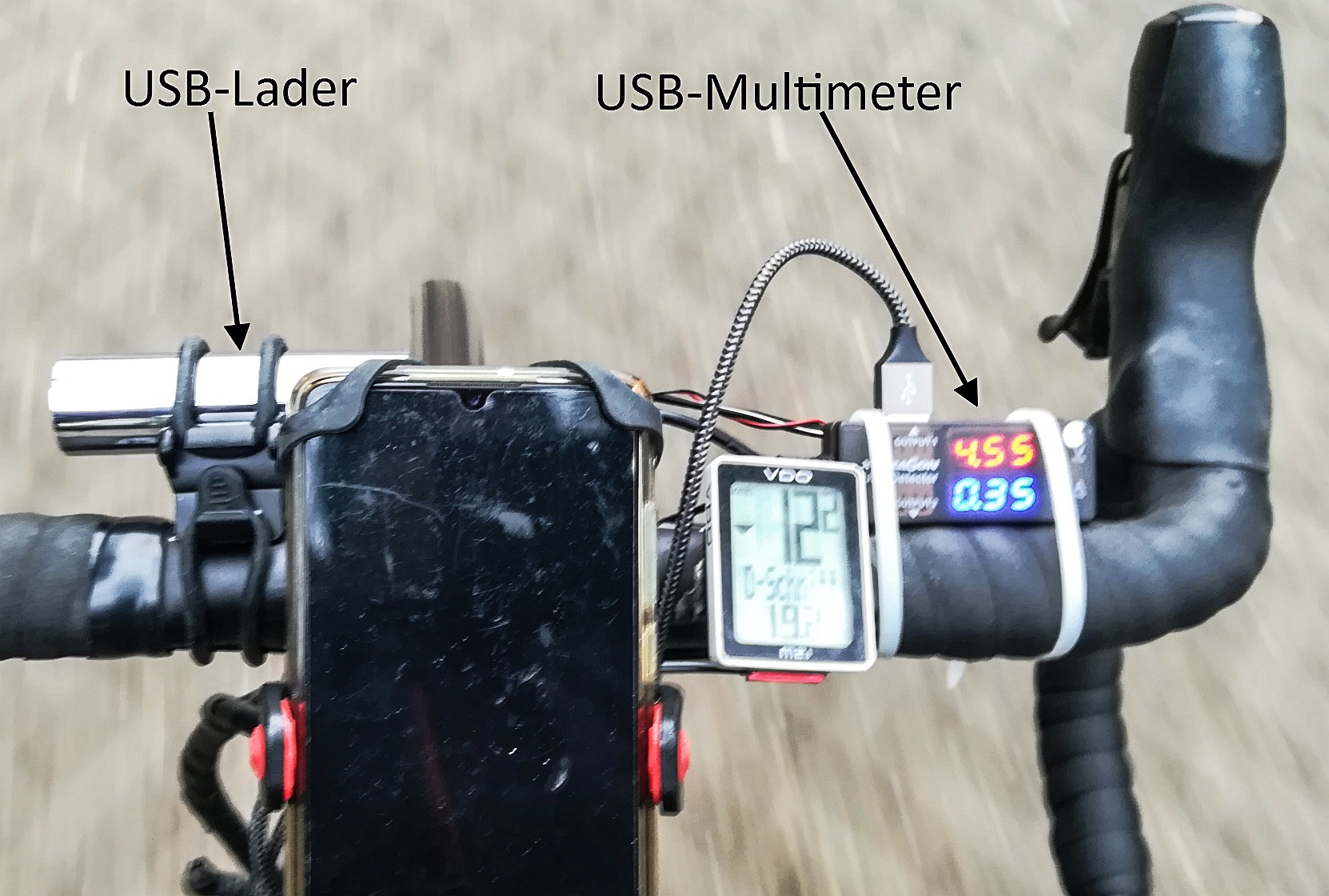 Die Leistung der kleinen Schaltung habe ich mit einem USB-Multimeter gemessen und die dazugehörige Geschwindigkeit vom Fahrradtacho abgelesen (siehe Bild 7). Die Ergebnisse sind mehr eine grobe Schätzung als eine exakte Messung. Getestet wurde mit zwei Fahrrädern mit unterschiedlichen Dynamos und zwei unterschiedlichen Handys.