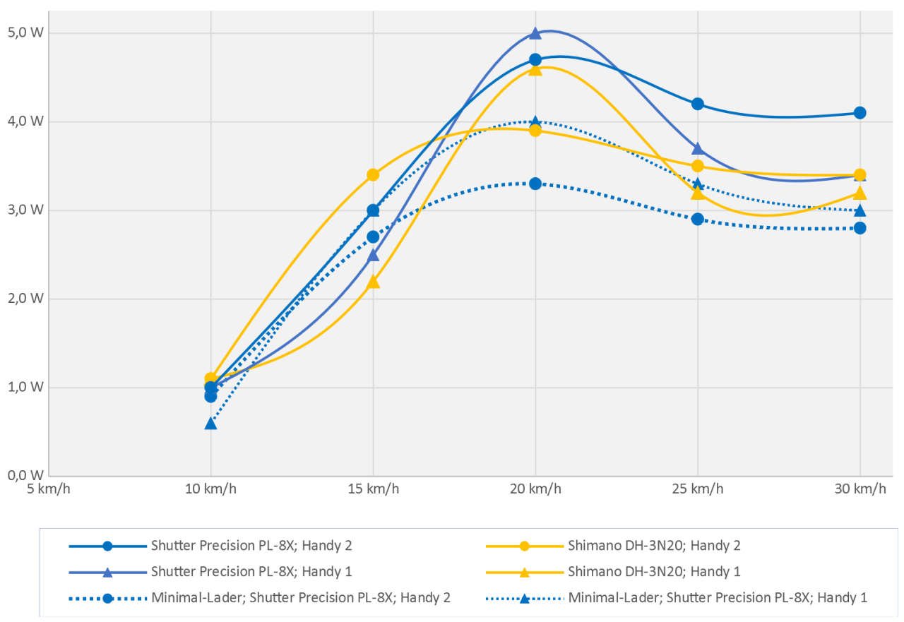In Bild 8 ist die gemessene Leistung dargestellt. Die gepunkteten Linien zeigen zum Vergleich den Minimal-Lader mit identischer Gleichrichterschaltung. Durch den Serienkondensator mit 340 µF kommt es zu einer Leistungsspitze bei circa 20 km/h. Der moderne Shutter Precision gibt mehr Leistung ab als der betagte Shimano DH-3N20. Gegenüber dem Minimal-Lader liefert der Step-Down-Regler bei größeren Geschwindigkeiten mehr Leistung. Während der Step-Down-Regler die dann auftretende höhere Spannung relativ verlustarm auf 5 V wandelt, wird diese Leistung beim Minimal-Lader an der Zenerdiode in Wärme gewandelt. Durch das Zusammenspiel von Handy und USB-Ladeschaltung im Step-Down-Regler ergeben sich Sprünge in der USB-Leistung, die man im Diagramm aufgrund der niedrigen Anzahl von Messwerten nicht sieht.