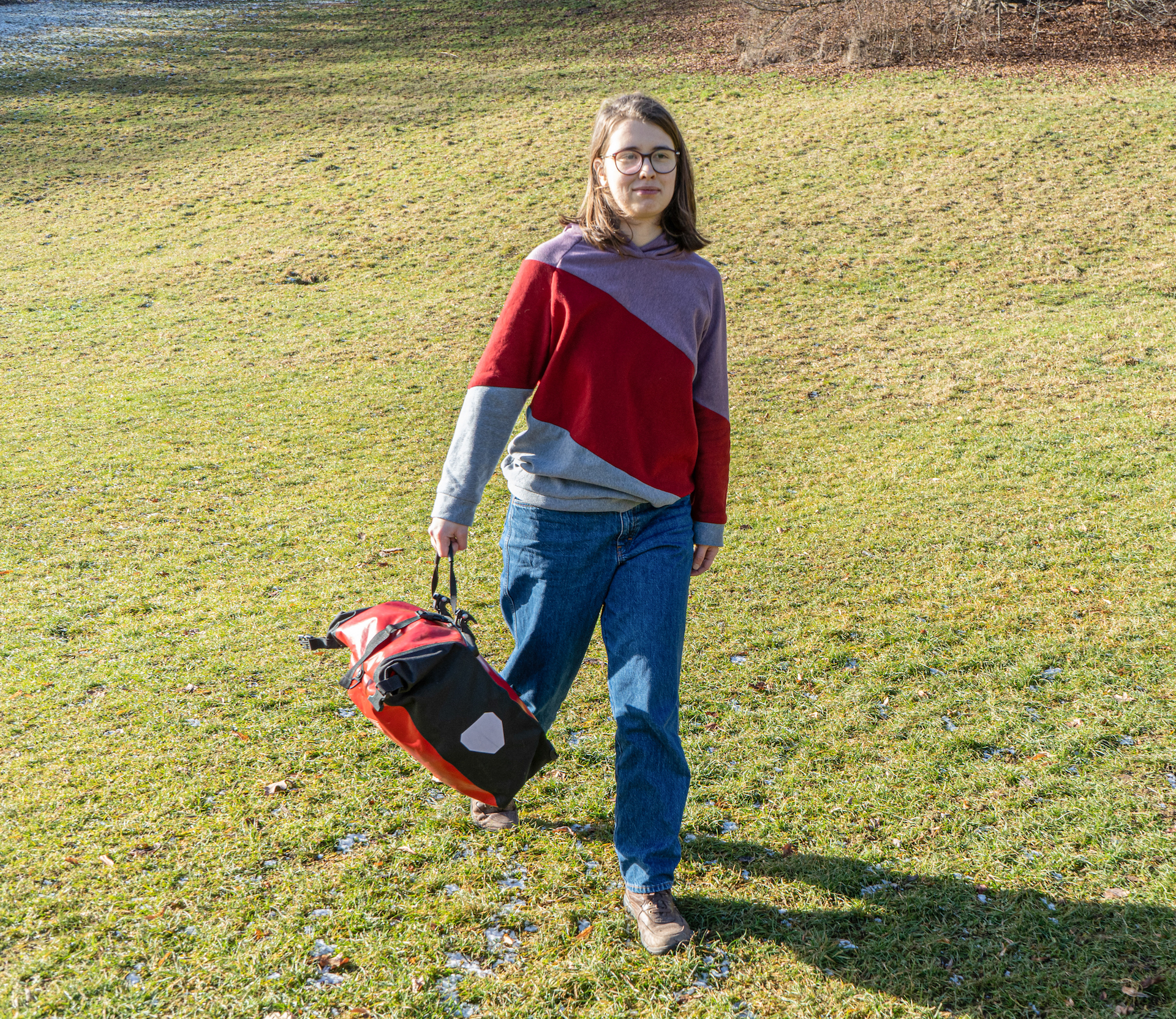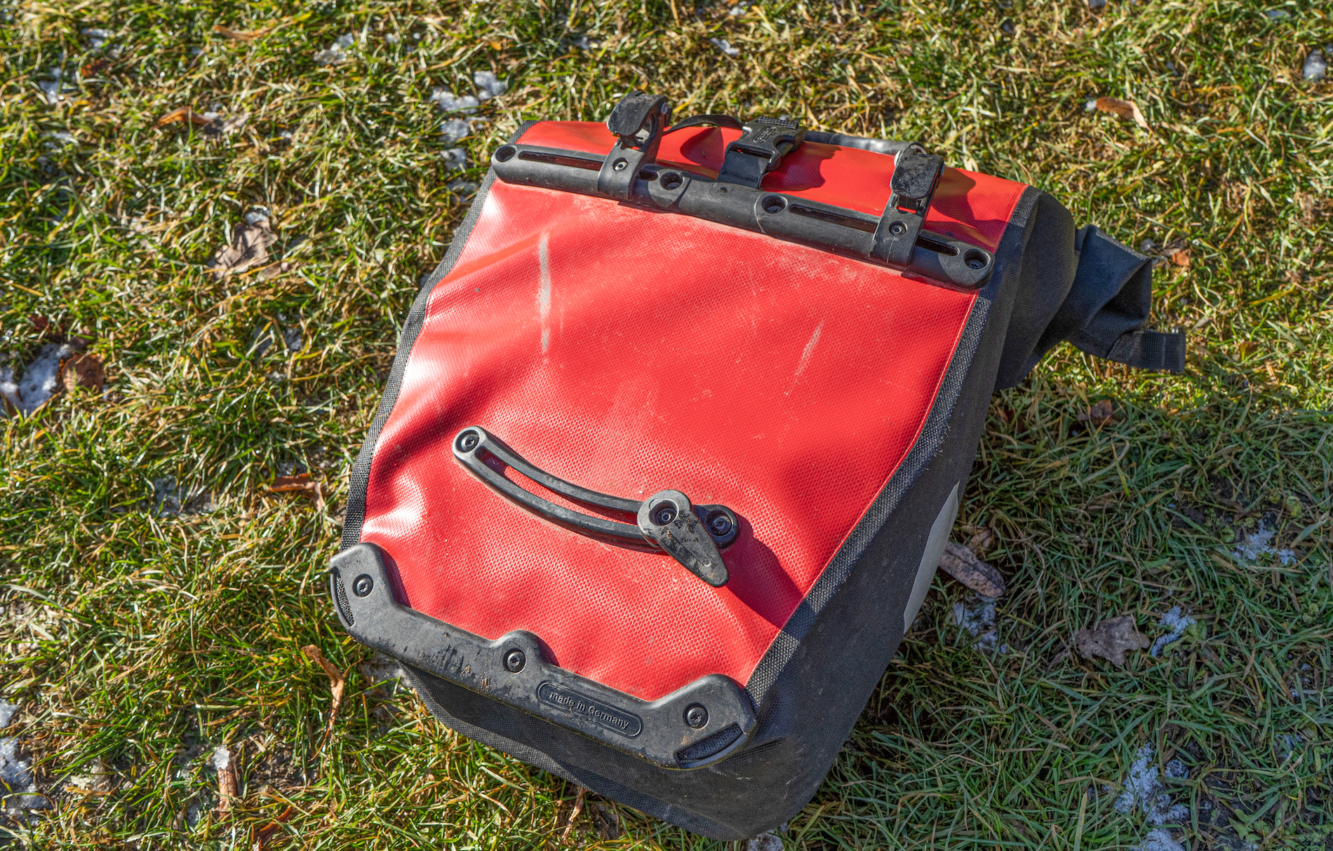 Besser wäre es, die Taschen oben am Rollverschluss zusammenzuklicken und dort zu tragen. Oder man macht es, wie Ortlieb sich das wohl vorstellt: Die Tasche wird mit dem Tragegurt via der Befestigung an der Front geschlossen, dann wird der kleine Gurt über die Oberseite gezogen und man hat einen sicheren Tragegriff. Prima auf Radreisen, aber mal eben beim Einkaufen etwas umständlich.