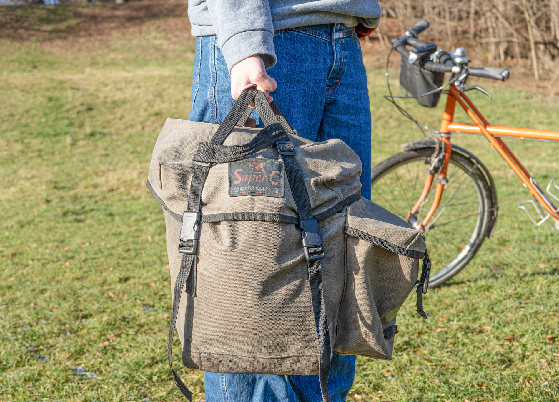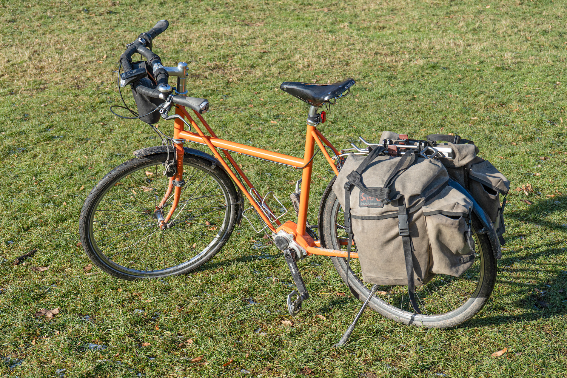 Weil das Volumen der Super C so groß ist, hab ich sie an mein Rad geklickt und bin von München nach Palermo geradelt – ohne Lowrider vorn. Und es hat wenig geregnet – ich hatte Sorge, dass Baumwolltuch vielleicht doch nicht expeditionstauglich ist. Die Taschen sind schwarz, zumindest waren sie es, als ich in München los bin. In Palermo waren sie dunkelgrau. Schuld war nicht der Straßenstaub, sondern die Sonne des Südens: UV-stabil ist die schwarze Farbe nicht. Die Taschen haben jetzt Patina und sehen weit gereist aus.