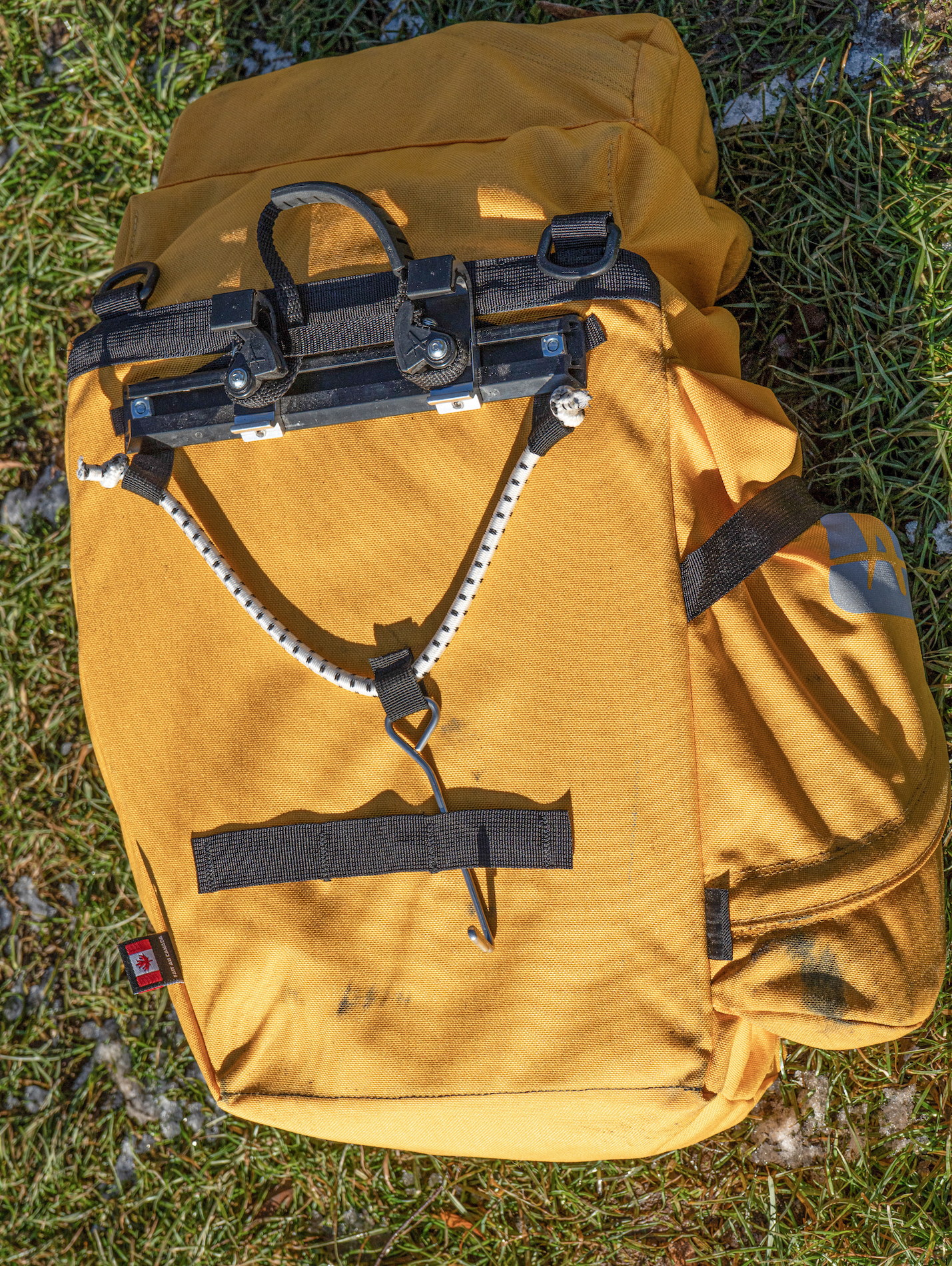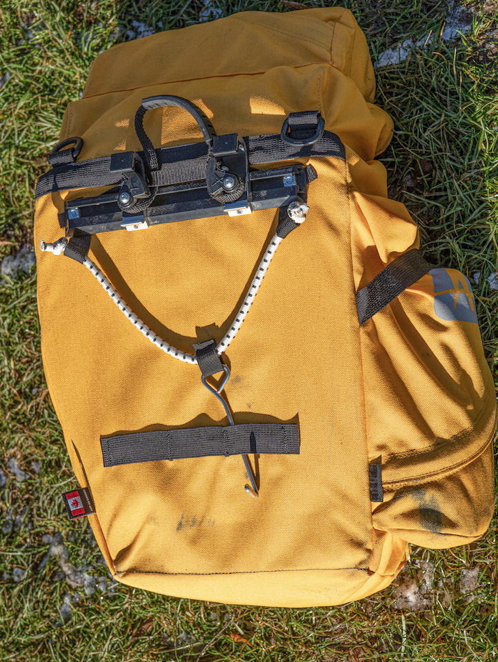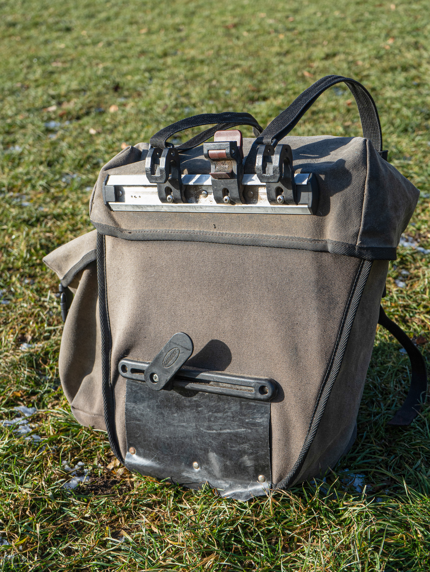 Die Befestigung am Rad ist ähnlich wie bei Ortlieb, die Sicherung der Taschen »nach oben« ist aber mit einem dritten Haken gelöst und nicht integriert. Alles ist gut verstellbar, aber mit Kreuzschlitz-Werkzeug. Die Montageschiene ist aus Metall, die Haken selber sind aus Kunststoff. Ich fand das stabil und simpel. Die Taschen lassen sich an einer stabilen Griffschlaufe am Deckel gut tragen, sehr solide. Genäht haben meine Taschen übrigens Sue und Pamela – steht drin …