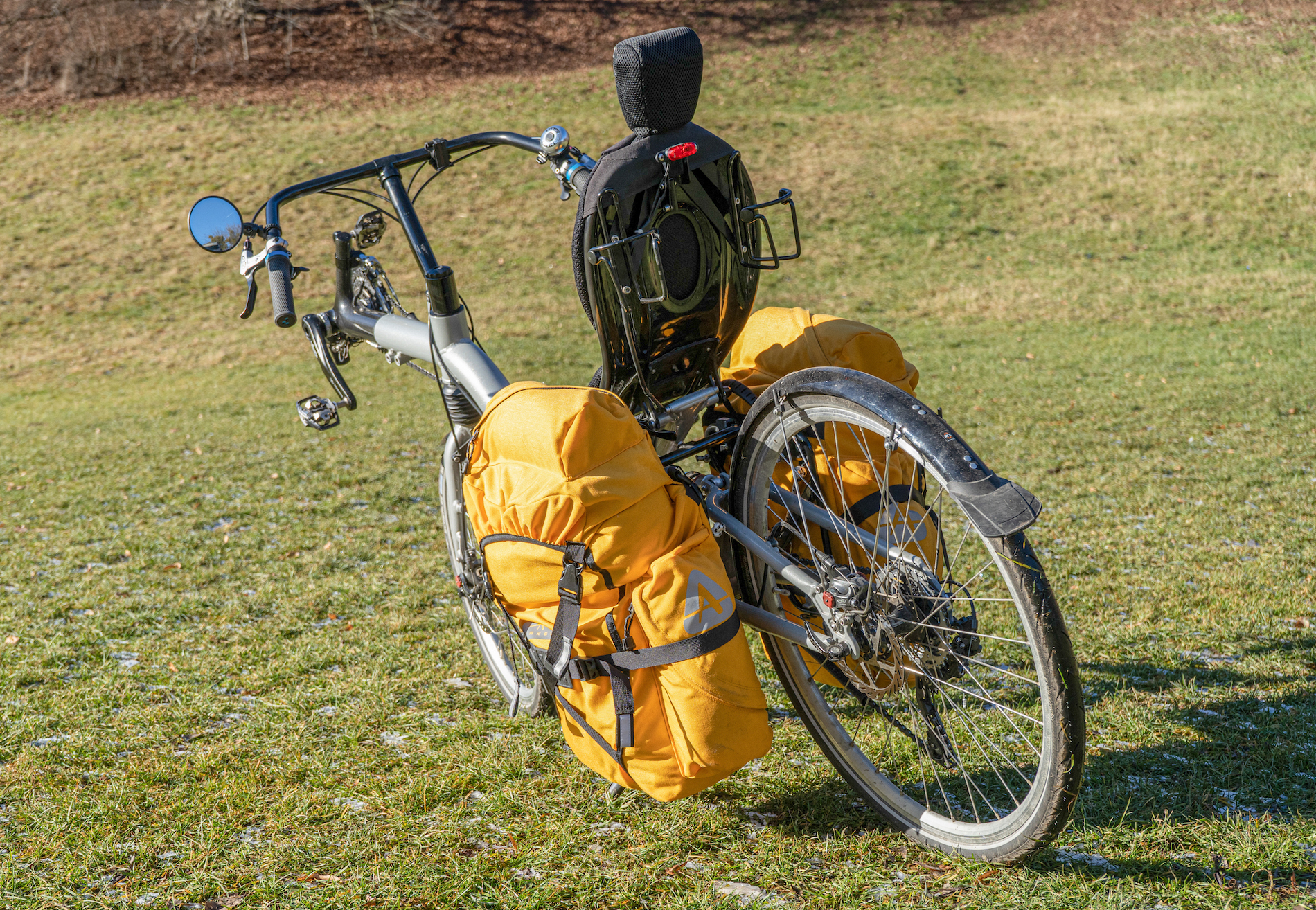 Ich hab eine hp Velotechnik Speedmachine mit einem Lowrider, die Taschen werden also unterhalb des Sitzes montiert. Das hab ich mit meinen Carradice-Taschen versucht. Ging nicht, sie sind zu groß und hängen zu tief – und schleifen in der Kurve. Die Ortliebs passen – klar, die passen immer, weil auch die Konstrukteure der Lowrider den Marktführer im Hinterkopf hatten. Aber ich wollte etwas mehr Platz haben und für die Reisen mit dem Lieger nur zwei Taschen verwenden.