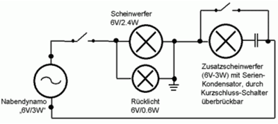 Bild 1 zeigt wie es funktioniert: Eine herkömmliche Lichtanlage mit 6-V-2,4-W-Scheinwerfer und parallelem Rücklicht wird ergänzt durch einen Zusatzscheinwerfer mit 6-V-3-W-Halogenbirnchen und ggf. einem Kondensator.