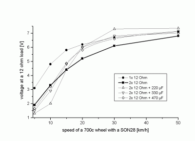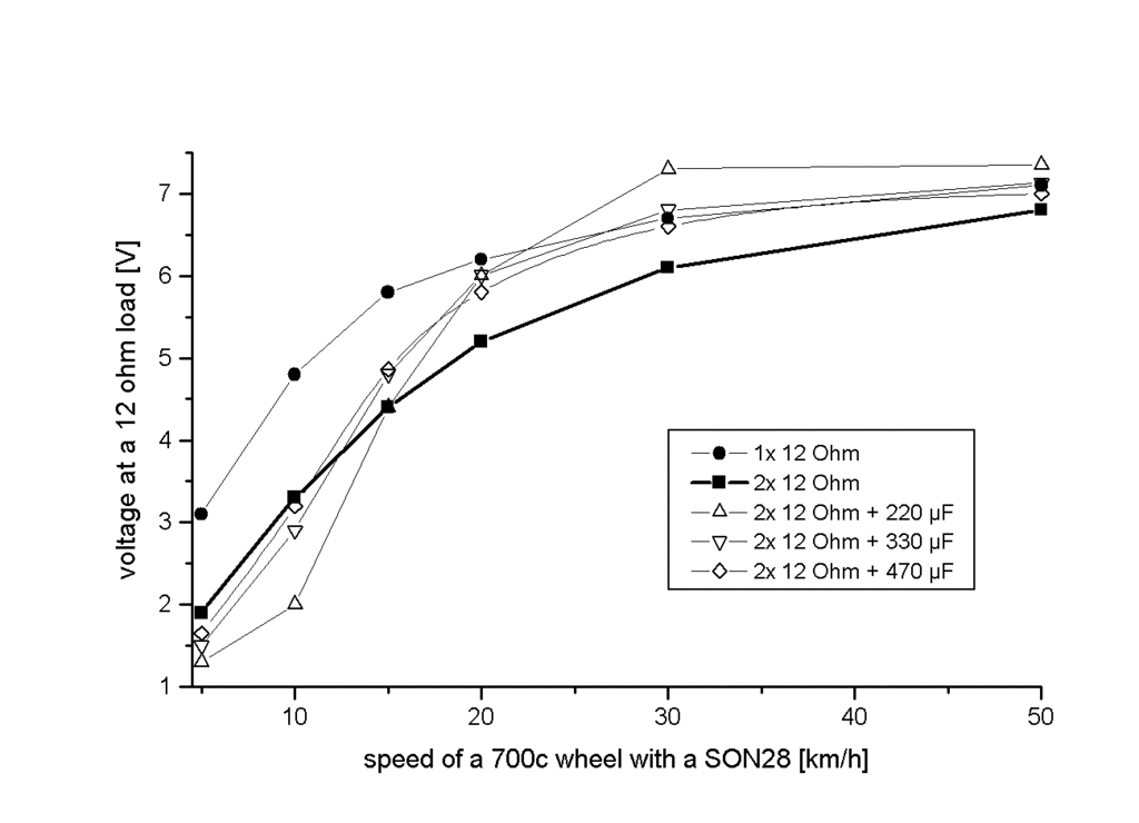 Ein SON28 im 28″-Laufrad wird bei Geschwindigkeiten von 5–50 km/h betrieben. Angeschlossen sind die unter 1.) genannten Widerstände bzw. Kondensatoren in Reihenschaltung. Gemessen wird die Spannung an jeweils einem 12 Ω Widerstand.