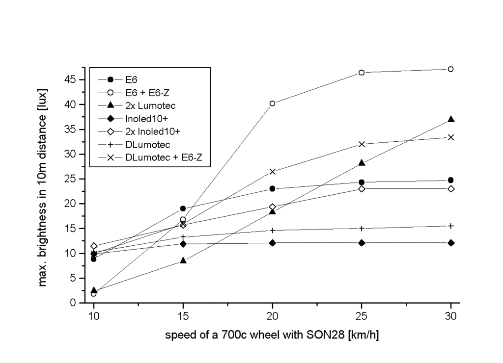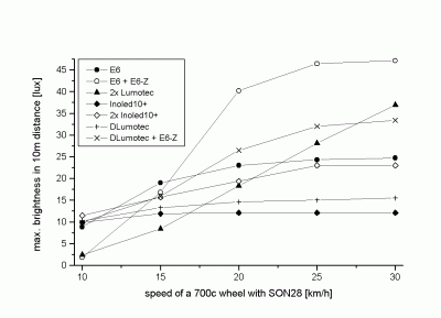 Verschiedene Leuchten und deren Kombination als »Doppel-Scheinwerfer« werden an einem SON28 im 28″-Laufrad bei Geschwindigkeiten von 10–30 km/h betrieben. An einer Wand in 10m Entfernung wird die maximale Beleuchtungsstärke (in Lux) gemessen.