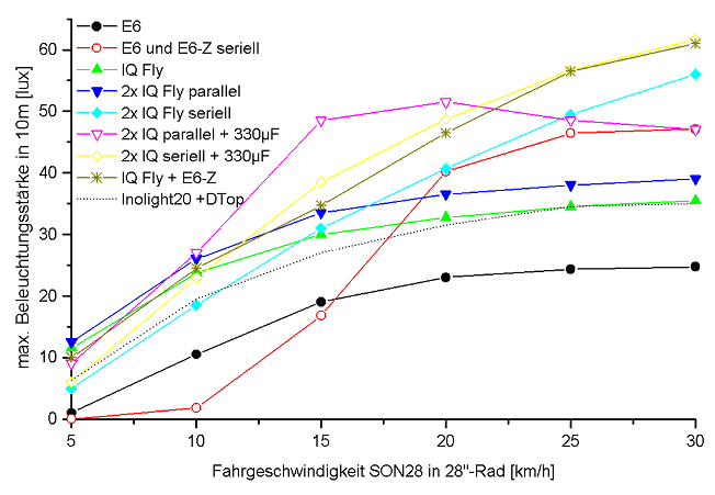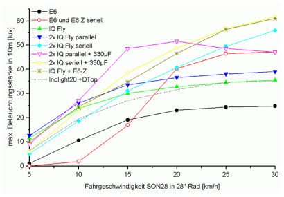 Ergebnis: Die Kombination E6 plus E6-Z in Reihenschaltung ist bei 20–30 km/h mit Abstand am hellsten. Bei >30 km/h holt der doppelte Lumotec (ohne Serienkondensator) auf. Bei unter 20 km/h für den doppelten Lumotec bzw. unter 15 km/h für E6 plus E6-Z ist es sinnvoll auf nur einen Halogenscheinwerfer zurückzuschalten um mehr Licht zu erhalten.